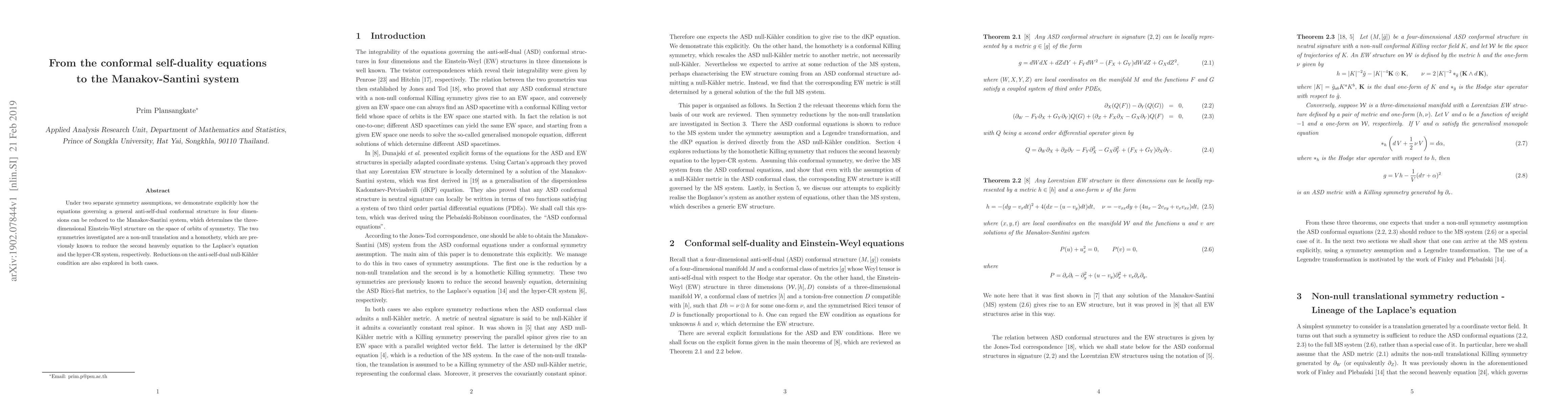 This paper demonstrates how the conformal self-duality equations in four dimensions can be reduced to the Manakov-Santini system through two symmetry assumptions: non-null translation and homothety. These reductions also explore the anti-self-dual null-Kähler condition.