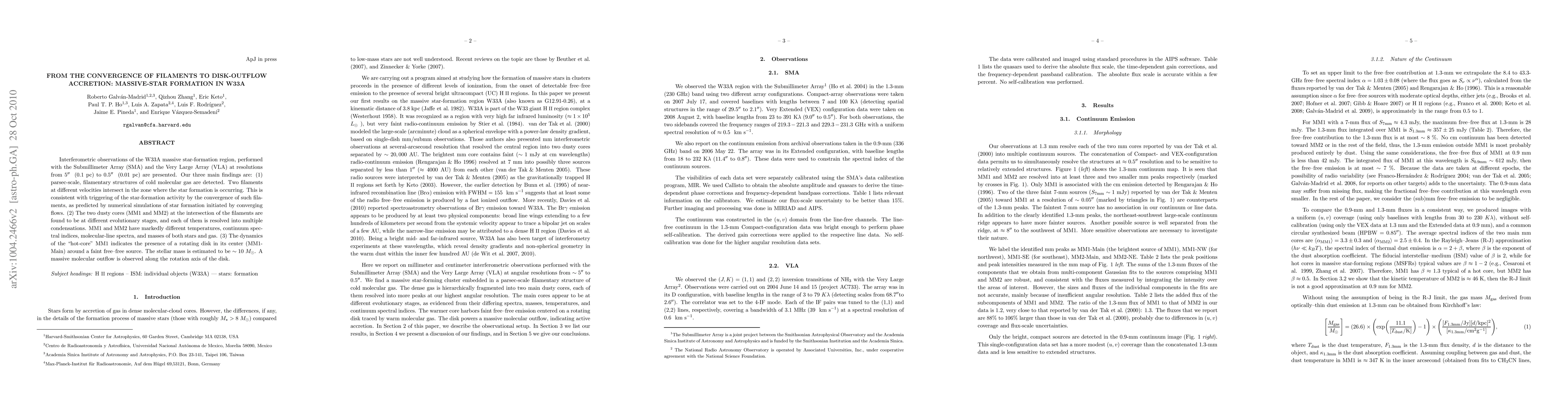 Interferometric observations of the W33A massive star-formation region, performed with the Submillimeter Array (SMA) and the Very Large Array (VLA) at resolutions from 5 arcsec (0.1 pc) to 0.5 arcsec (0.01 pc) are presented. Our three main findings are: (1) parsec-scale, filamentary structures of cold molecular gas are detected. Two filaments at different velocities intersect in the zone where the star formation is occurring. This is consistent with triggering of the star-formation activity by the convergence of such filaments, as predicted by numerical simulations of star formation initiated by converging flows. (2) The two dusty cores (MM1 and MM2) at the intersection of the filaments are found to be at different evolutionary stages, and each of them is resolved into multiple condensations. MM1 and MM2 have markedly different temperatures, continuum spectral indices, molecular-line spectra, and masses of both stars and gas. (3) The dynamics of the "hot-core" MM1 indicates the presence of a rotating disk in its center (MM1-Main) around a faint free-free source. The stellar mass is estimated to be approximately 10 Msun. A massive molecular outflow is observed along the rotation axis of the disk.