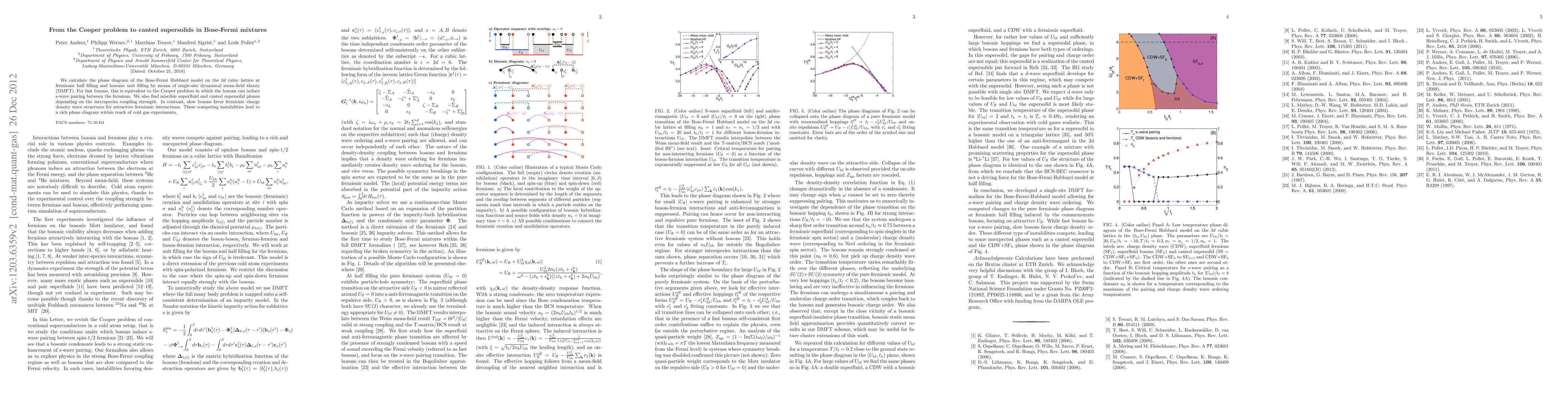 We calculate the phase diagram of the Bose-Fermi Hubbard model on the 3d cubic lattice at fermionic half filling and bosonic unit filling by means of single-site dynamical mean-field theory. For fast bosons, this is equivalent to the Cooper problem in which the bosons can induce s-wave pairing between the fermions. We also find miscible superfluid and canted supersolid phases depending on the interspecies coupling strength. In contrast, slow bosons favor fermionic charge density wave structures for attractive fermionic interactions. These competing instabilities lead to a rich phase diagram within reach of cold gas experiments.