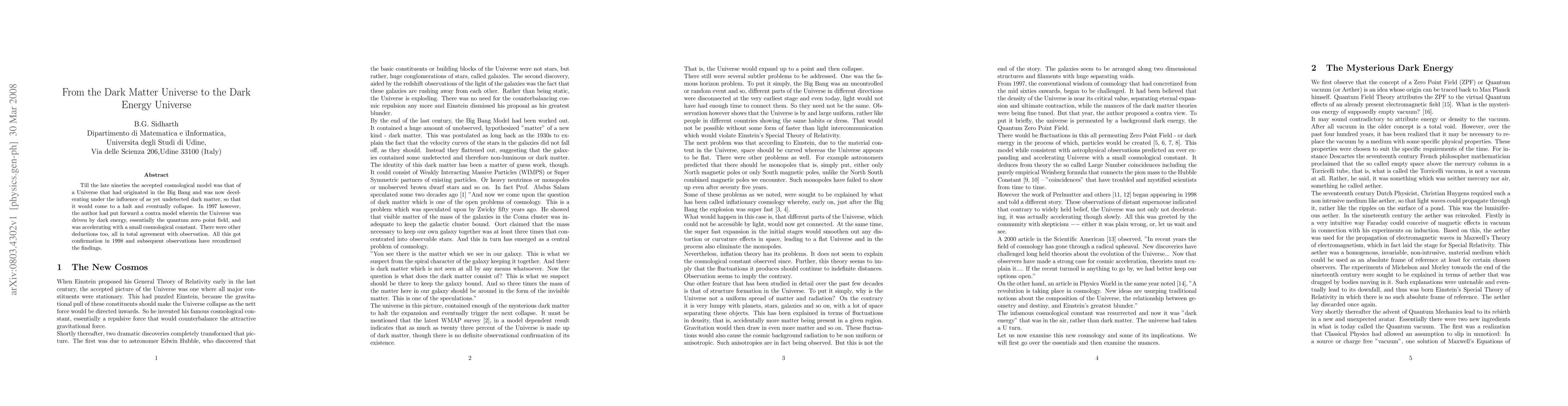 Till the late nineties the accepted cosmological model was that of a Universe that had originated in the Big Bang and was now decelerating under the influence of as yet undetected dark matter, so that it would come to a halt and eventually collapse. In 1997 however, the author had put forward a contra model wherein the Universe was driven by dark energy, essentially the quantum zero point field, and was accelerating with a small cosmological constant. There were other deductions too, all in total agreement with observation. All this got confirmation in 1998 and subsequent observations have reconfirmed the findings.