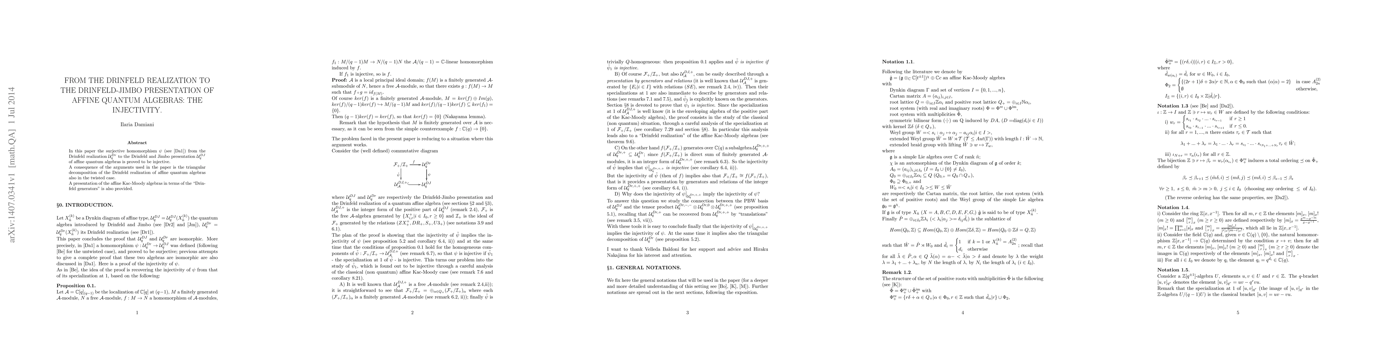 This paper proves the injectivity of the surjective homomorphism from the Drinfeld realization to the Drinfeld-Jimbo presentation of affine quantum algebras, establishing a triangular decomposition in the twisted case and providing a presentation for affine Kac-Moody algebras using "Drinfeld generators."