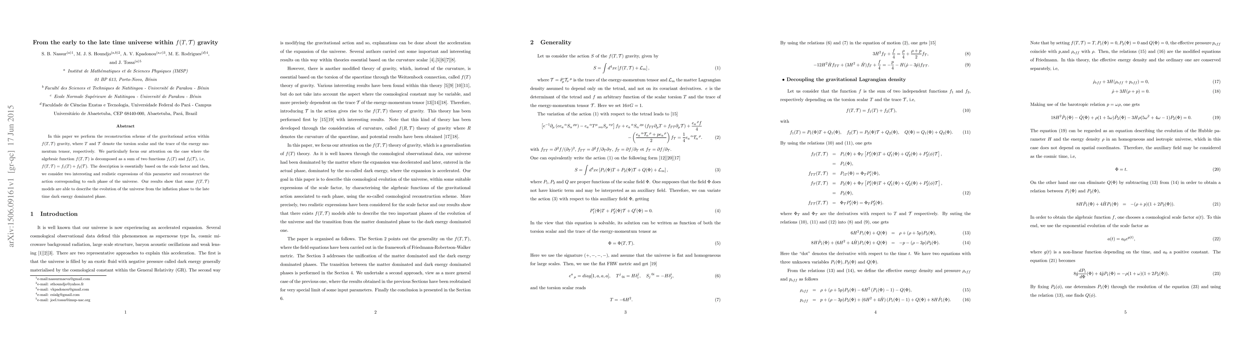 This paper reconstructs the gravitational action in $f(T,\mathcal{T})$ gravity, decomposing $f(T,\mathcal{T})$ into $f_1(T) + f_2(\mathcal{T})$, and explores its application to the universe's evolution from inflationary to dark energy-dominated phases. The study finds that certain models can describe this transition.