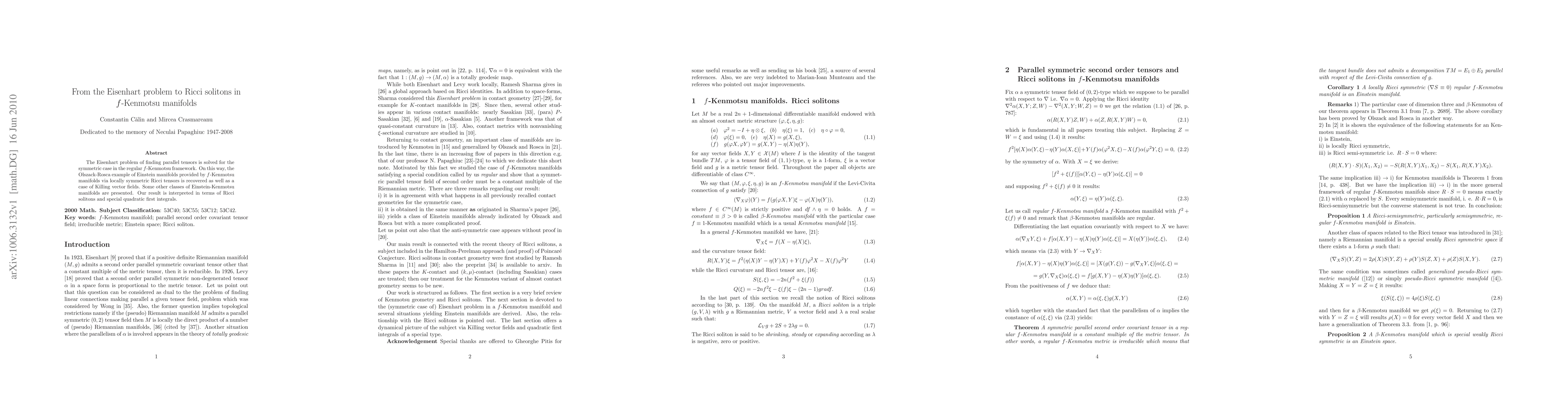 The Eisenhart problem of finding parallel tensors is solved for the symmetric case in the regular $f$-Kenmotsu framework. On this way, the Olszack-Rosca example of Einstein manifolds provided by $f$-Kenmotsu manifolds via locally symmetric Ricci tensors is recovered as well as a case of Killing vector fields. Some other classes of Einstein-Kenmotsu manifolds are presented. Our result is interpreted in terms of Ricci solitons and special quadratic first integrals.
