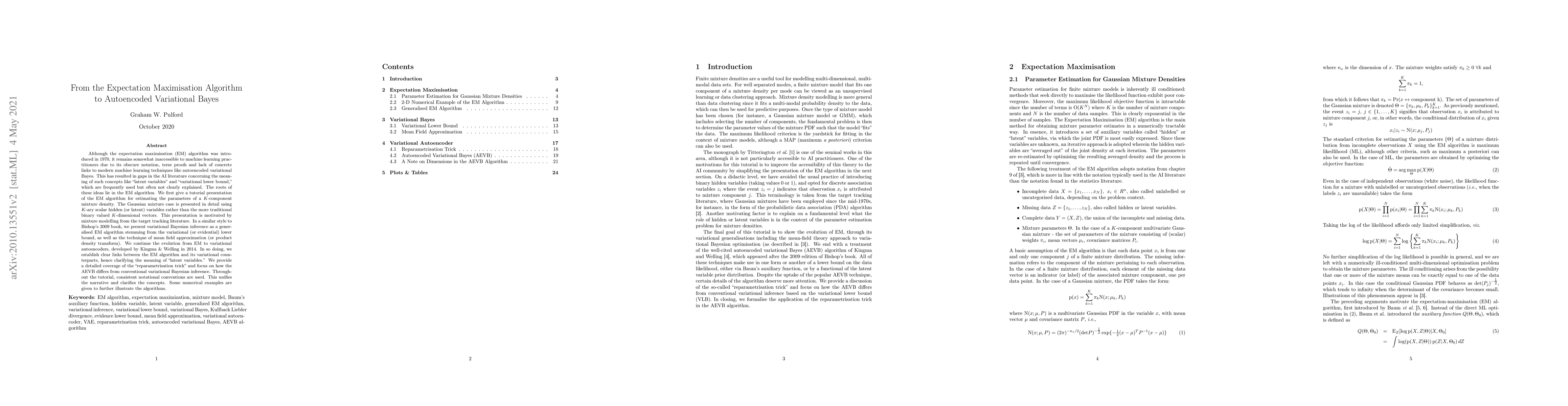 This paper provides a tutorial on the expectation maximisation (EM) algorithm, linking it to modern machine learning techniques like autoencoded variational Bayes. It clarifies the concepts of "latent variables" and "variational lower bound" by tracing their roots back to EM, and explains the evolution to variational autoencoders, using consistent notation to unify the narrative.
