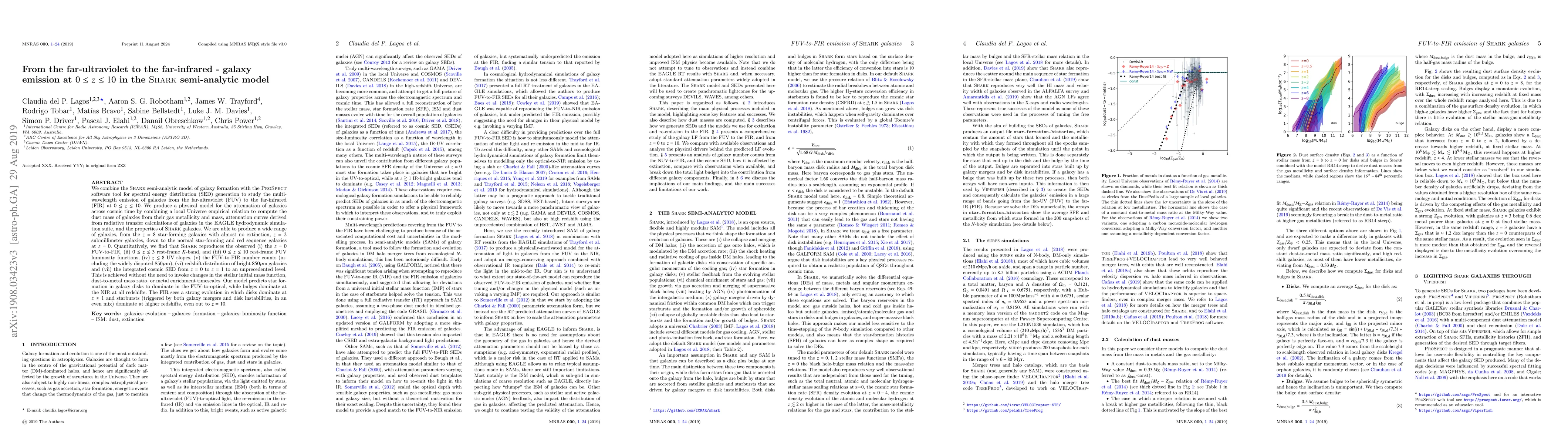 This paper combines the Shark semi-analytic model with ProSpect to study galaxy emission across wavelengths from FUV to FIR at $0\le z \le 10$. It successfully reproduces various observed galaxy luminosity functions, UV slopes, and cosmic SED, predicting that star formation in disks dominates in the FUV-to-optical, while bulges and starbursts dominate at NIR and FIR, respectively.