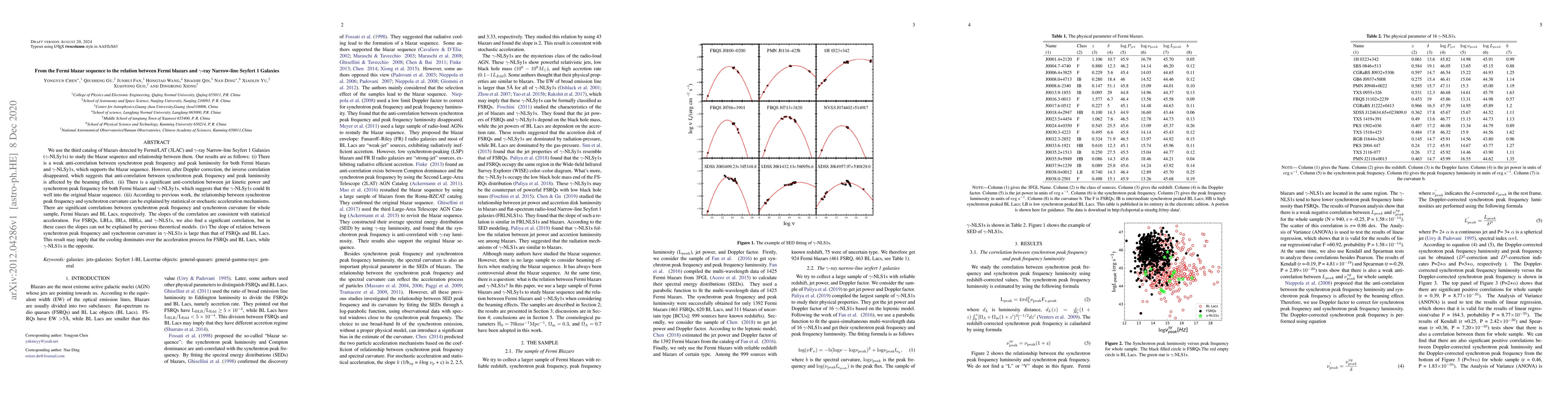 We use the third catalog of blazars detected by Fermi/LAT (3LAC) and gamma-ray Narrow-line Seyfert 1 Galaxies (gamma-NLSy1s) to study the blazar sequence and relationship between them. Our results are as follows: (i) There is a weak anti-correlation between synchrotron peak frequency and peak luminosity for both Fermi blazars and gamma-NLSy1s, which supports the blazar sequence. However, after Doppler correction, the inverse correlation disappeared, which suggests that anti-correlation between synchrotron peak frequency and peak luminosity is affected by the beaming effect. (ii) There is a significant anti-correlation between jet kinetic power and synchrotron peak frequency for both Fermi blazars and gamma-NLSy1s, which suggests that the gamma-NLSy1s could fit well into the original blazar sequence. (iii) According to previous work, the relationship between synchrotron peak frequency and synchrotron curvature can be explained by statistical or stochastic acceleration mechanisms. There are significant correlations between synchrotron peak frequency and synchrotron curvature for whole sample, Fermi blazars and BL Lacs, respectively. The slopes of the correlation are consistent with statistical acceleration. For FSRQs, LBLs, IBLs, HBLs, and gamma-NLS1s, we also find a significant correlation, but in these cases the slopes can not be explained by previous theoretical models. (iv) The slope of relation between synchrotron peak frequency and synchrotron curvature in gamma-NLS1s is large than that of FSRQs and BL Lacs. This result may imply that the cooling dominates over the acceleration process for FSRQs and BL Lacs, while gamma-NLS1s is the opposite.