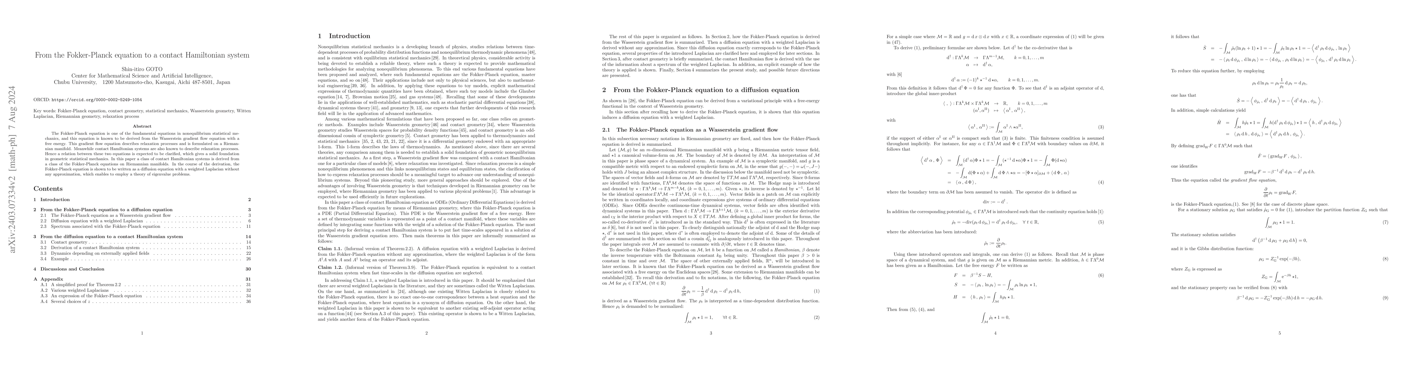 This paper derives a class of contact Hamiltonian systems from the Fokker-Planck equation, demonstrating a solid geometric foundation in nonequilibrium statistical mechanics by relating relaxation processes described by both equations. The Fokker-Planck equation is reformulated as a diffusion equation with a weighted Laplacian, allowing for the application of eigenvalue problem theory.