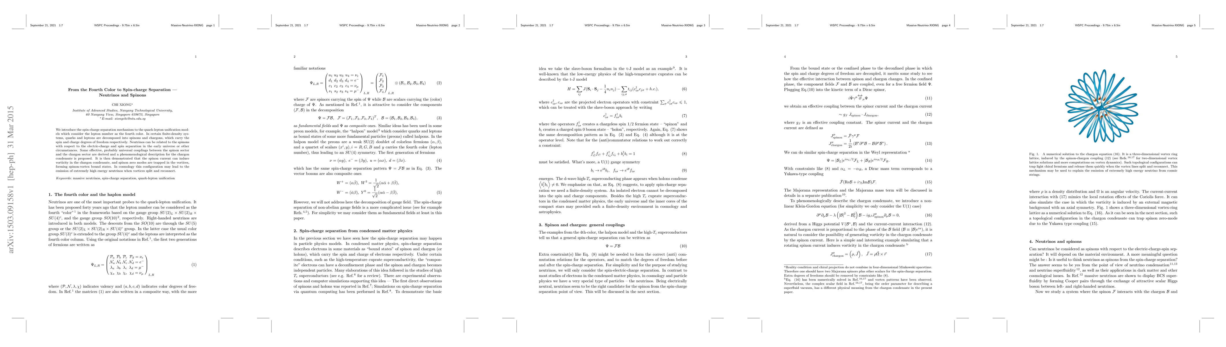 We introduce the spin-charge separation mechanism to the quark-lepton unification models which consider the lepton number as the fourth color. In certain finite-density systems, quarks and leptons are decomposed into spinons and chargons, which carry the spin and charge degrees of freedom respectively. Neutrinos can be related to the spinons with respect to the electric-charge and spin separation in the early universe or other circumstances. Some effective, probably universal couplings between the spinon sector and the chargon sector are derived and a phenomenological description for the chargon condensate is proposed. It is then demonstrated that the spinon current can induce vorticity in the chargon condensate, and spinon zero modes are trapped in the vortices, forming spinon-vortex bound states. In cosmology this configuration may lead to the emission of extremely high energy neutrinos when vortices split and reconnect.