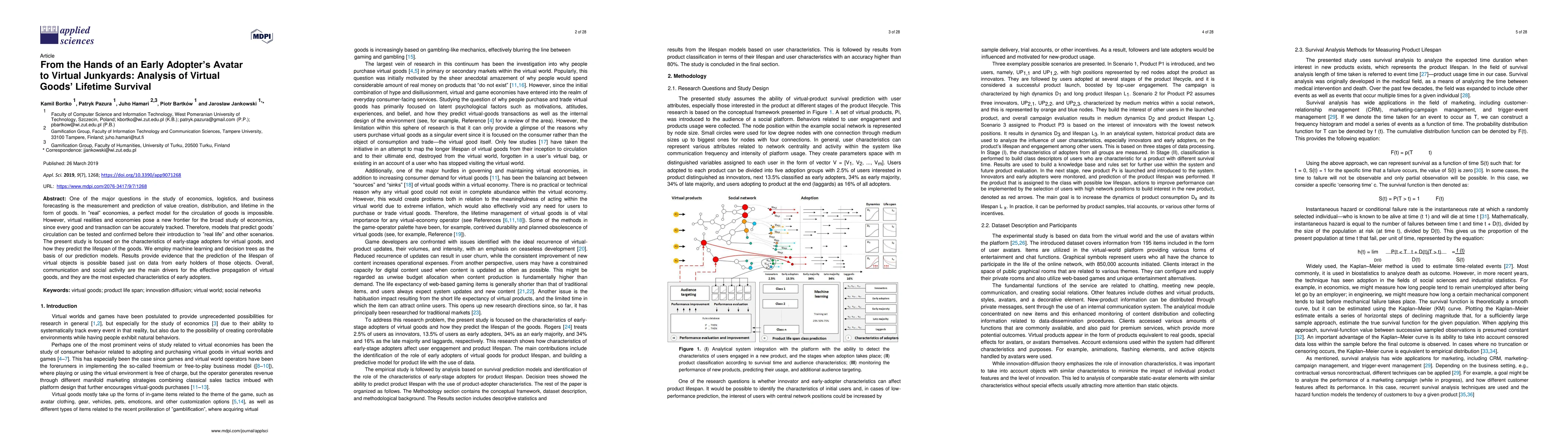 One of the major questions in the study of economics, logistics, and business forecasting is the measurement and prediction of value creation, distribution, and lifetime in the form of goods. In "real" economies, a perfect model for the circulation of goods is impossible. However, virtual realities and economies pose a new frontier for the broad study of economics, since every good and transaction can be accurately tracked. Therefore, models that predict goods' circulation can be tested and confirmed before their introduction to "real life" and other scenarios. The present study is focused on the characteristics of early-stage adopters for virtual goods, and how they predict the lifespan of the goods. We employ machine learning and decision trees as the basis of our prediction models. Results provide evidence that the prediction of the lifespan of virtual objects is possible based just on data from early holders of those objects. Overall, communication and social activity are the main drivers for the effective propagation of virtual goods, and they are the most expected characteristics of early adopters.