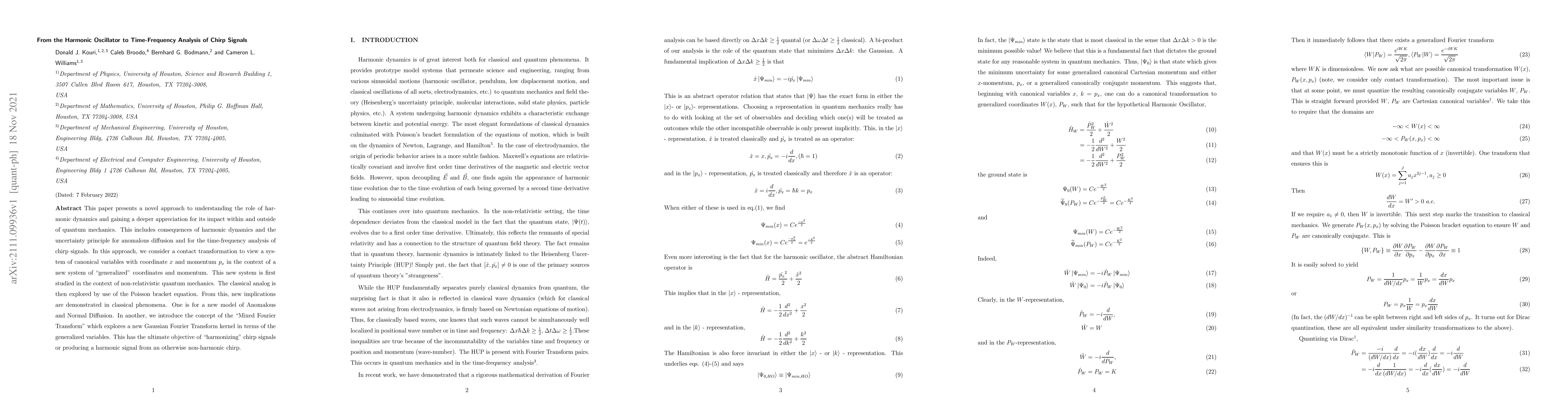 This paper presents a novel approach to understanding the role of harmonic dynamics and gaining a deeper appreciation for its impact within and outside of quantum mechanics. This includes consequences of harmonic dynamics and the uncertainty principle for anomalous diffusion and for the time-frequency analysis of chirp signals. In this approach, we consider a contact transformation to view a system of canonical variables with coordinate $x$ and momentum $p_x$ in the context of a new system of "generalized" coordinates and momentum. This new system is first studied in the context of non-relativistic quantum mechanics. The classical analog is then explored by use of the Poisson bracket equation. From this, new implications are demonstrated in classical phenomena. One is for a new model of Anomalous and Normal Diffusion. In another, we introduce the concept of the "Mixed Fourier Transform" which explores a new Gaussian Fourier Transform kernel in terms of the generalized variables. This has the ultimate objective of "harmonizing" chirp signals or producing a harmonic signal from an otherwise non-harmonic chirp.