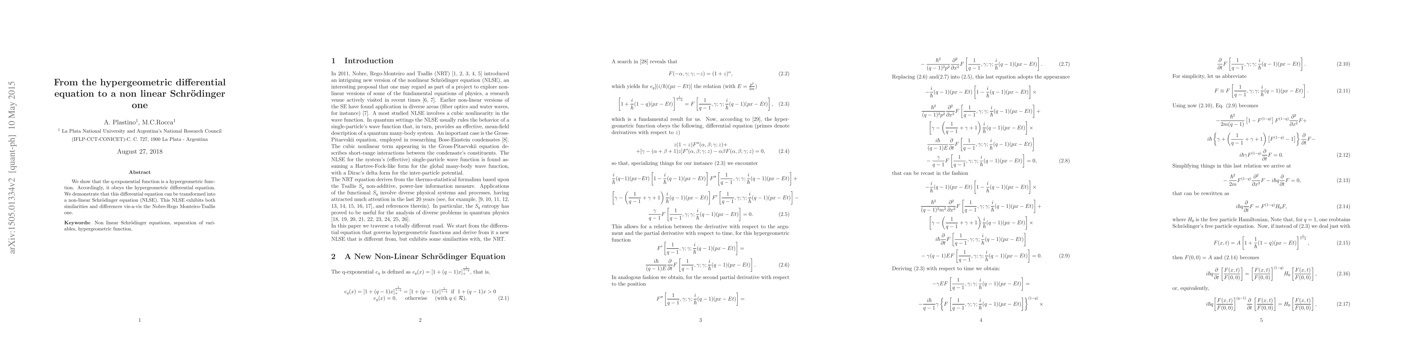 Summary: This paper establishes a connection between the q-exponential function and the hypergeometric differential equation, subsequently showing that the latter transforms into a non-linear Schrödinger equation (NLSE). The derived NLSE is compared with the Nobre-Rego Monteiro-Tsallis NLSE, highlighting both its similarities and distinctions.