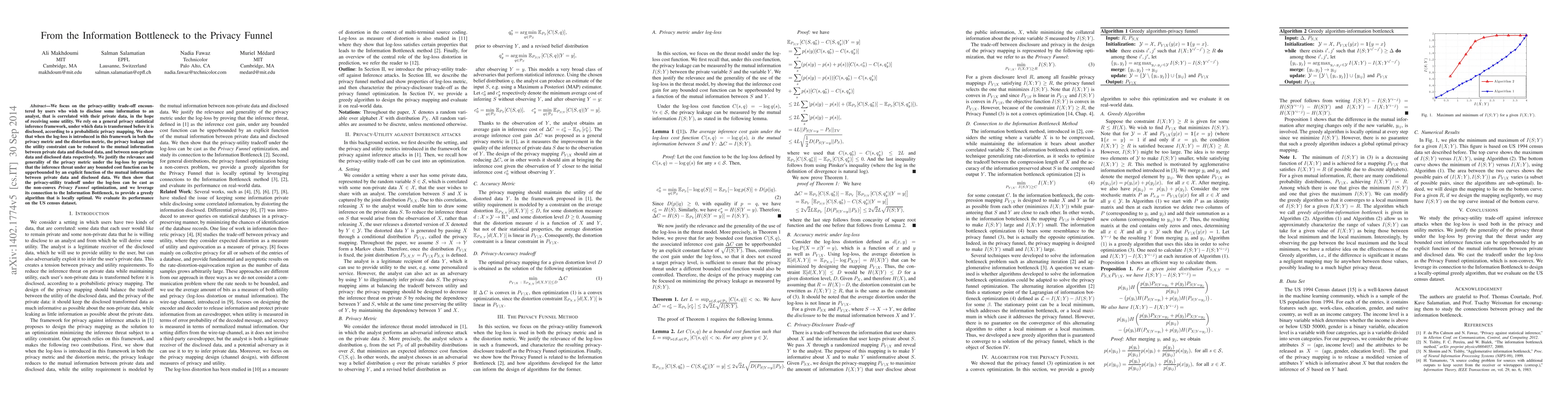 We focus on the privacy-utility trade-off encountered by users who wish to disclose some information to an analyst, that is correlated with their private data, in the hope of receiving some utility. We rely on a general privacy statistical inference framework, under which data is transformed before it is disclosed, according to a probabilistic privacy mapping. We show that when the log-loss is introduced in this framework in both the privacy metric and the distortion metric, the privacy leakage and the utility constraint can be reduced to the mutual information between private data and disclosed data, and between non-private data and disclosed data respectively. We justify the relevance and generality of the privacy metric under the log-loss by proving that the inference threat under any bounded cost function can be upper-bounded by an explicit function of the mutual information between private data and disclosed data. We then show that the privacy-utility tradeoff under the log-loss can be cast as the non-convex Privacy Funnel optimization, and we leverage its connection to the Information Bottleneck, to provide a greedy algorithm that is locally optimal. We evaluate its performance on the US census dataset.