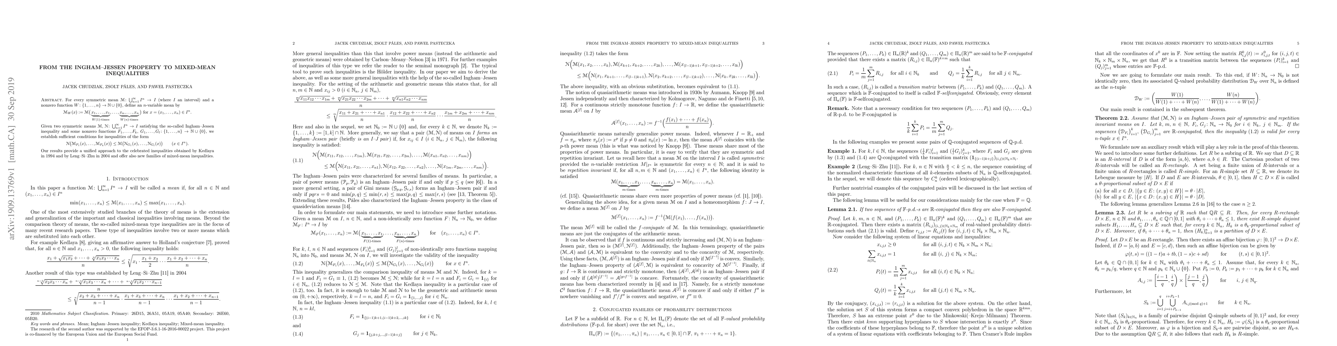 For every symmetric mean $\mathscr{M} \colon \bigcup_{n=1}^\infty I^n \to I$ (where $I$ an interval) and a nonzero function $W \colon \{1,\dots,n\} \to \mathbb{N} \cup \{0\}$, define an $n$-variable mean by $$\mathscr{M}_W(x):=\mathscr{M}\big(\underbrace{x_1,\dots,x_1}_{W(1)\text{-times}},\dots,\underbrace{x_n,\dots,x_n}_{W(n)\text{-times}}\big) \text{ for }x=(x_1,\dots,x_n) \in I^n.$$ Given two symmetric means $\mathscr{M},\,\mathscr{N} \colon \bigcup_{n=1}^\infty I^n \to I$ satisfying the so-called Ingham--Jessen inequality and some nonzero functions $F_1,\dots,F_k$, $G_1,\dots,G_l \colon \{1,\dots,n\} \to \mathbb{N} \cup \{0\}$, we establish sufficient conditions for inequalities of the form $$\mathscr{N} \big( \mathscr{M}_{F_1}(x),\dots,\mathscr{M}_{F_k}(x)\big) \le \mathscr{M} \big( \mathscr{N}_{G_1}(x),\dots,\mathscr{N}_{G_l}(x)\big) \qquad(x \in I^n).$$ Our results provide a unified approach to the celebrated inequalities obtained by Kedlaya in 1994 and by Leng--Si--Zhu in 2004 and offer also new families of mixed-mean inequalities.