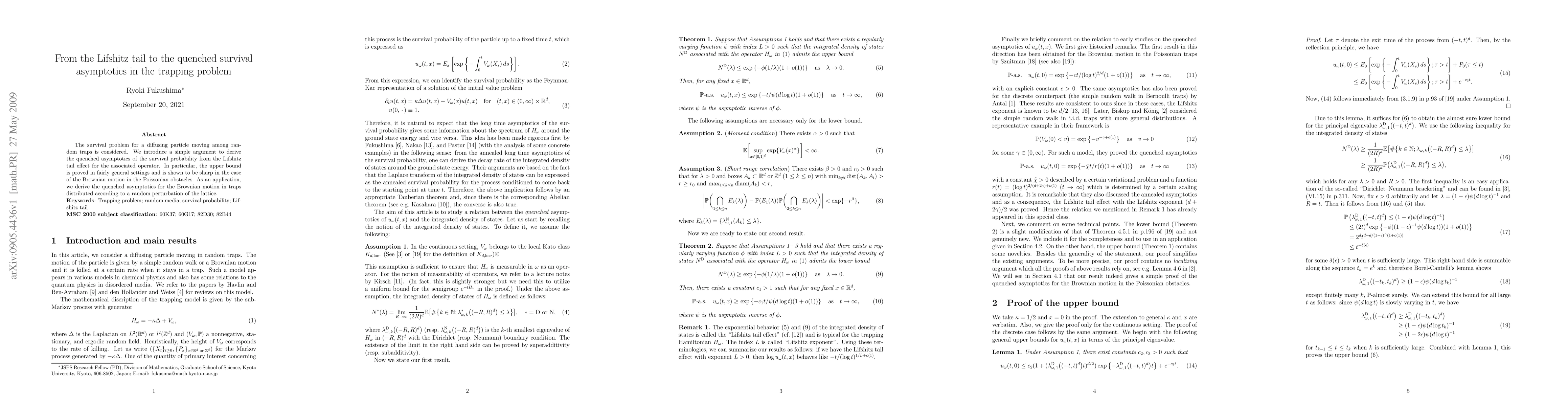 The survival problem for a diffusing particle moving among random traps is considered. We introduce a simple argument to derive the quenched asymptotics of the survival probability from the Lifshitz tail effect for the associated operator. In particular, the upper bound is proved in fairly general settings and is shown to be sharp in the case of the Brownian motion in the Poissonian obstacles. As an application, we derive the quenched asymptotics for the Brownian motion in traps distributed according to a random perturbation of the lattice.