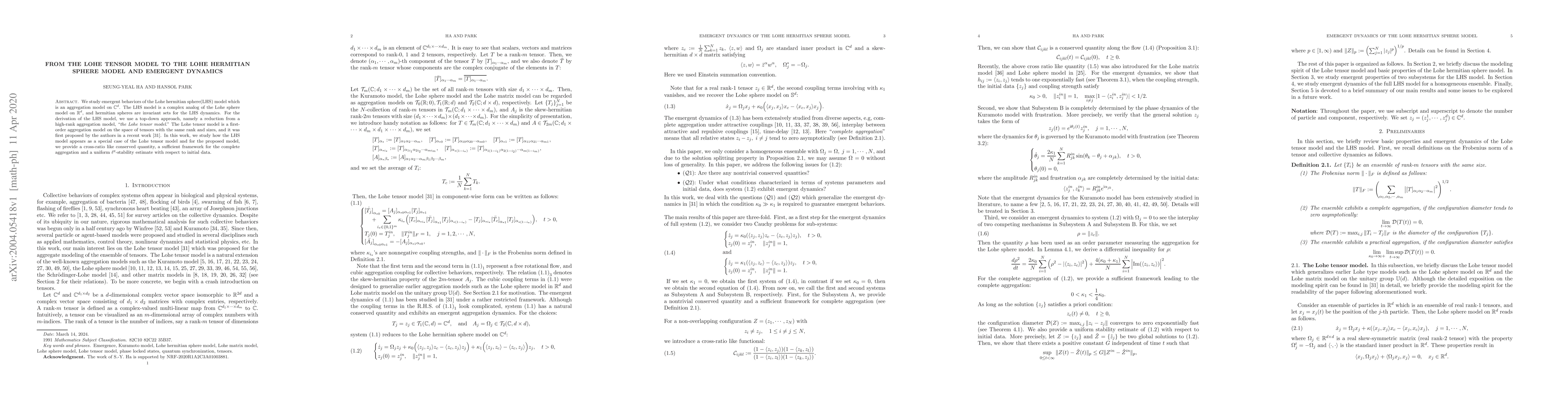 Researchers studied how a new model, the Lohe Hermitian sphere (LHS) model, emerges from a more complex tensor-based model, and found it preserves certain properties like a conserved quantity.
