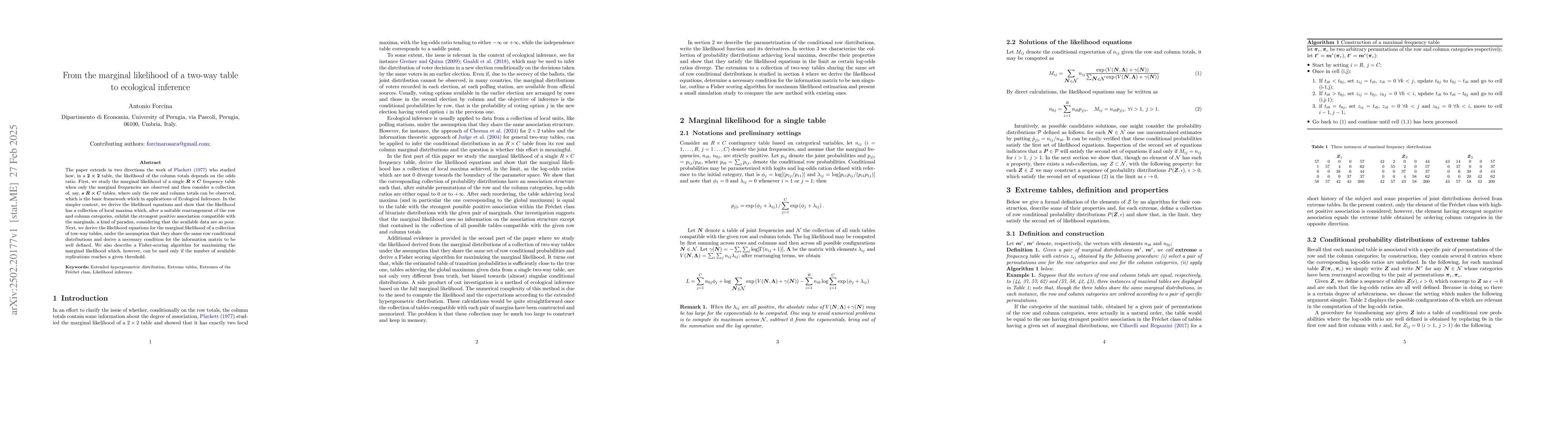 The paper introduces a method for deriving likelihood equations and a Fisher-scoring algorithm for maximizing the marginal likelihood of a collection of two-way tables, which is a significant theoretical contribution to ecological inference.