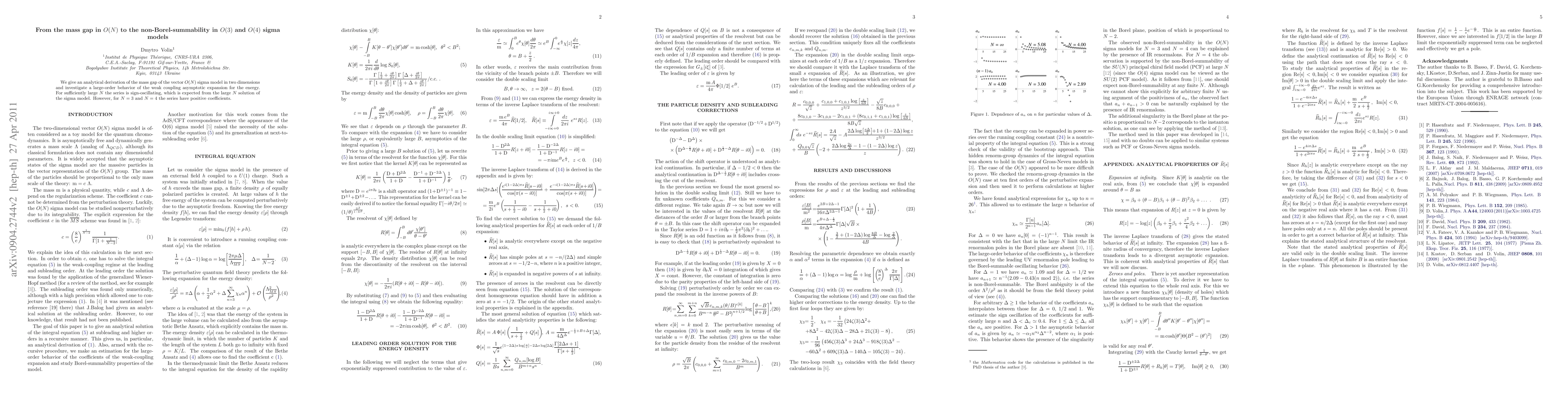 This paper analytically derives the mass gap in O(N) sigma models and examines the large-order behavior of the weak coupling asymptotic expansion for the energy. For large N, the series exhibits sign-oscillation, but for N=3 and N=4, the series remains sign positive, challenging the expected behavior.