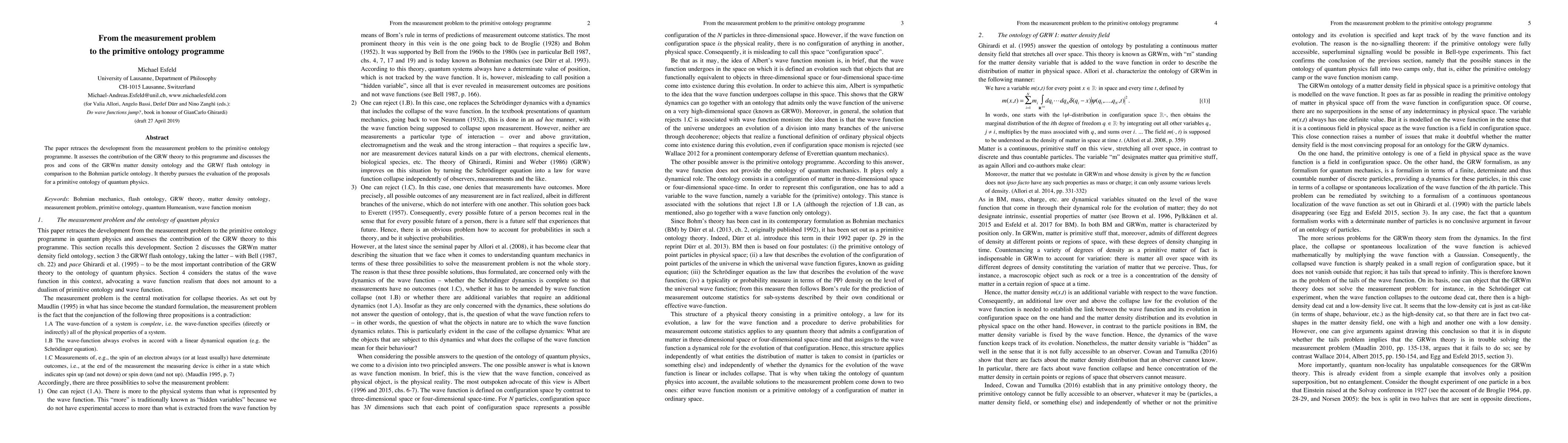 The paper explores the evolution from the measurement problem to the primitive ontology programme, evaluating the GRW theory's contribution and comparing the GRWm and GRWf ontologies against the Bohmian particle ontology in the context of quantum physics. It assesses the merits and drawbacks of these ontological frameworks.