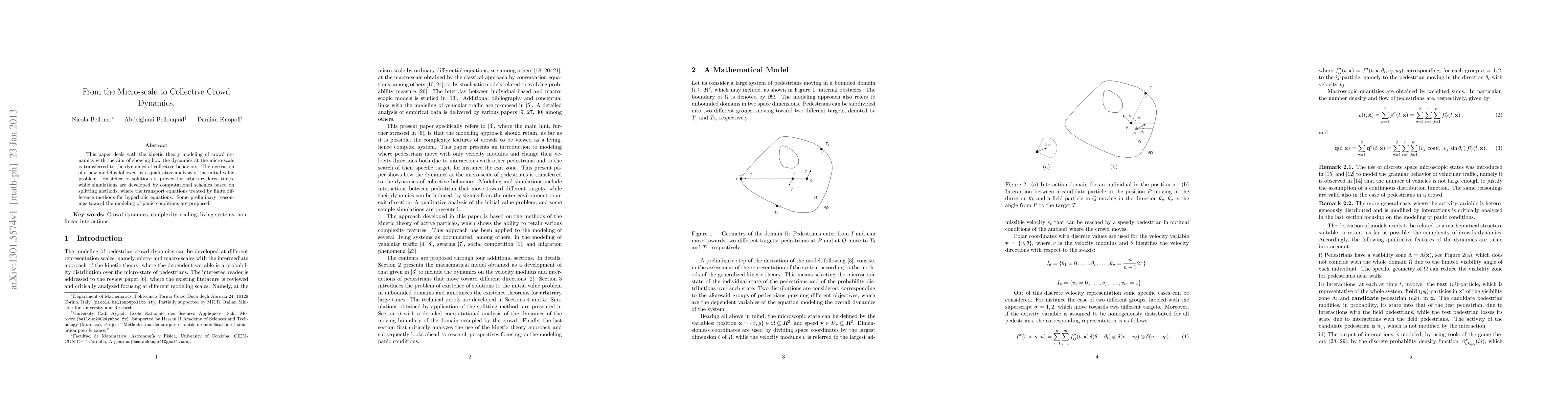 This paper deals with the kinetic theory modeling of crowd dynamics with the aim of showing how the dynamics at the micro-scale is transferred to the dynamics of collective behaviors. The derivation of a new model is followed by a qualitative analysis of the initial value problem. Existence of solutions is proved for arbitrary large times, while simulations are developed by computational schemes based on splitting methods, where the transport equations treated by finite difference methods for hyperbolic equations. Some preliminary reasonings toward the modeling of panic conditions are proposed.