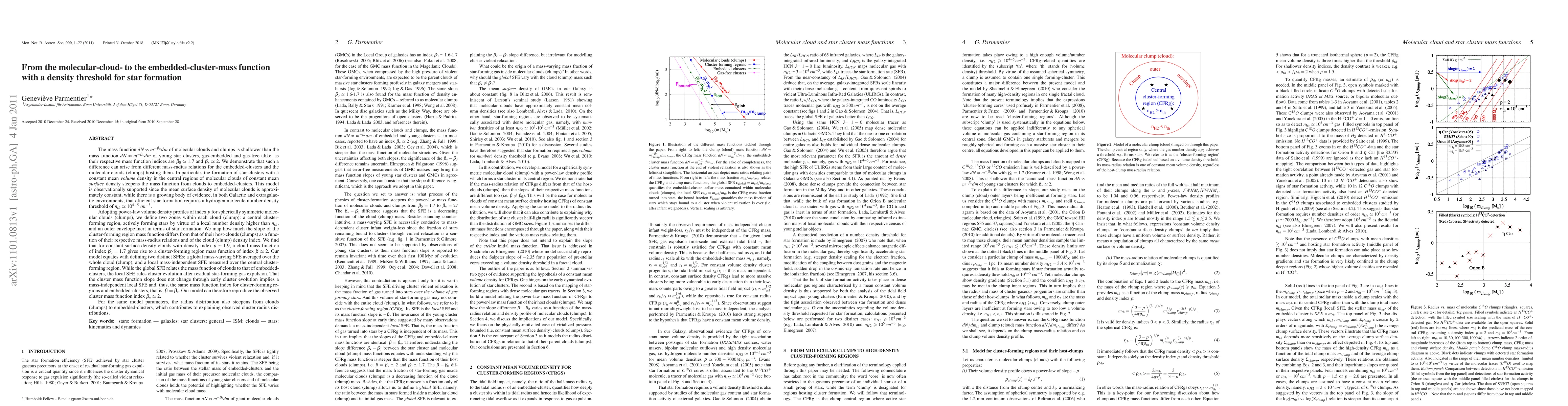 The mass function of molecular clouds and clumps is shallower than the mass function of young star clusters, gas-embedded and gas-free alike, as their respective mass function indices are $\beta_0 \simeq 1.7$ and $\beta_\star \simeq 2$. We demonstrate that such a difference can arise from different mass-radius relations for the embedded-clusters and the molecular clouds (clumps) hosting them. In particular, the formation of star clusters with a constant mean {\it volume} density in the central regions of molecular clouds of constant mean {\it surface} density steepens the mass function from clouds to embedded-clusters. This model is observationally supported since the mean surface density of molecular clouds is approximately constant, while there is a growing body of evidence, in both Galactic and extragalactic environments, that efficient star-formation requires a hydrogen molecule number density threshold of $n_{th} \simeq 10^{4-5}\,cm^{-3}$. In the framework of the same model, the radius distribution steepens from clouds (clumps) to embedded-clusters, which contributes to explaining observed cluster radius distributions. [Abridged]