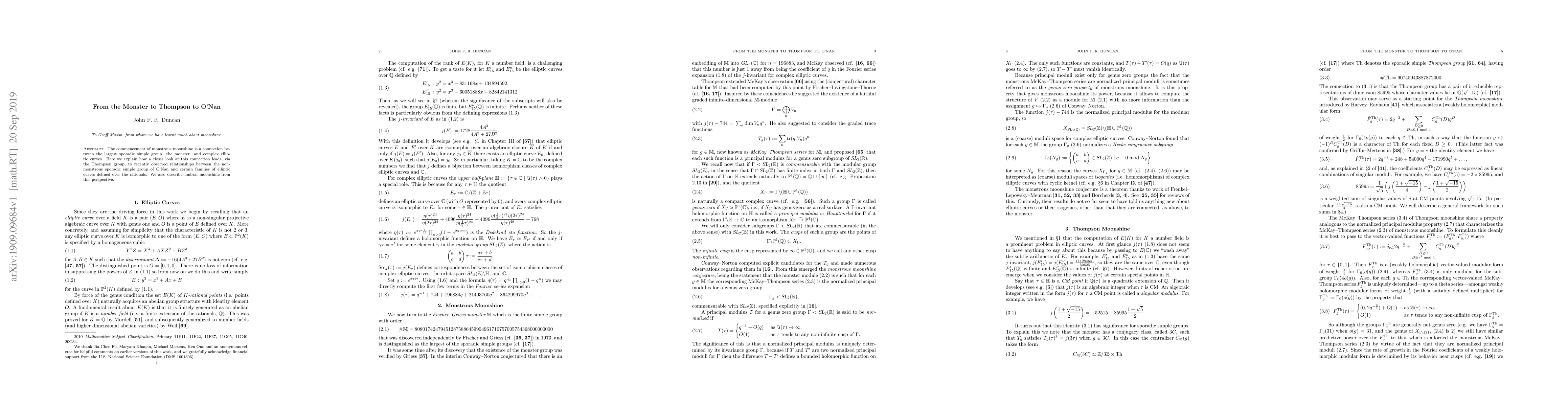 The paper explores the link between the largest sporadic simple group, the monster, and elliptic curves, tracing how this connection extends through the Thompson group to reveal new relationships between the O'Nan group and elliptic curves over rationals, including umbral moonshine.