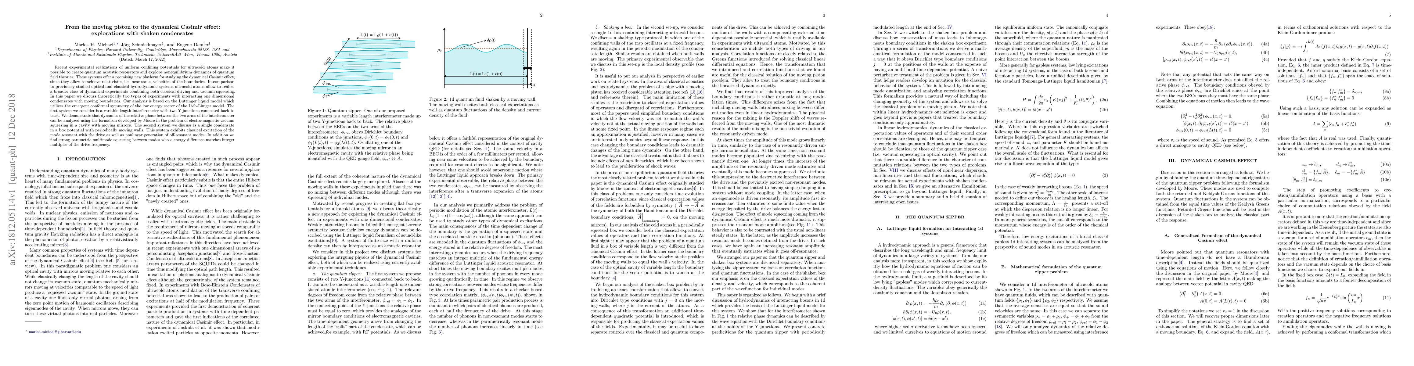 This paper explores nonequilibrium dynamics in quantum field theories using ultracold atom systems, focusing on the dynamical Casimir effect. It theoretically analyzes two experiments: a variable length interferometer with Y-junctions and a single condensate with periodically moving walls, revealing phenomena like vacuum squeezing and parametric multimode squeezing.