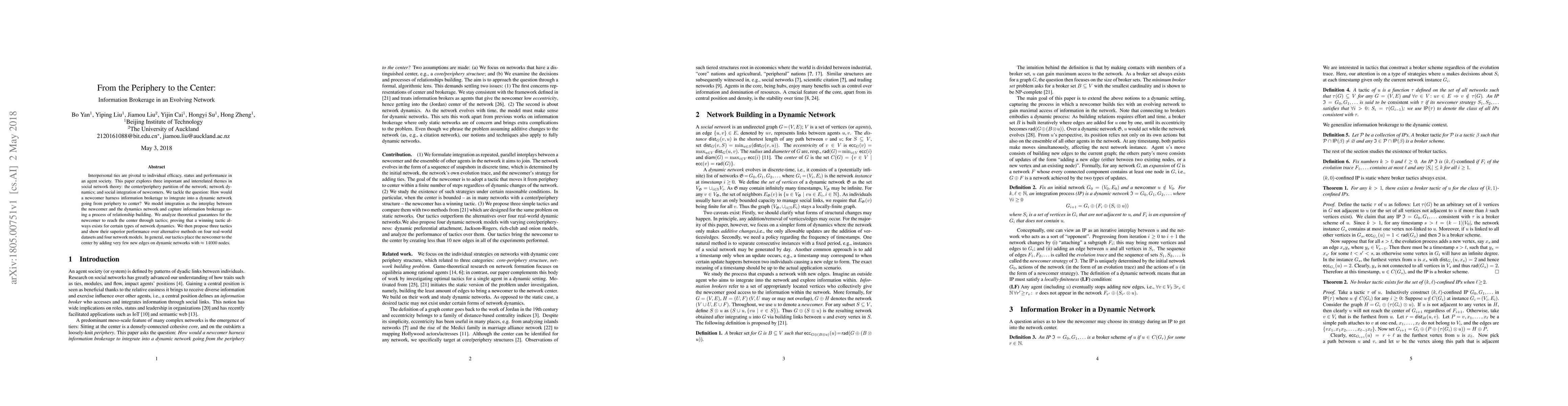 Interpersonal ties are pivotal to individual efficacy, status and performance in an agent society. This paper explores three important and interrelated themes in social network theory: the center/periphery partition of the network; network dynamics; and social integration of newcomers. We tackle the question: How would a newcomer harness information brokerage to integrate into a dynamic network going from periphery to center? We model integration as the interplay between the newcomer and the dynamics network and capture information brokerage using a process of relationship building. We analyze theoretical guarantees for the newcomer to reach the center through tactics; proving that a winning tactic always exists for certain types of network dynamics. We then propose three tactics and show their superior performance over alternative methods on four real-world datasets and four network models. In general, our tactics place the newcomer to the center by adding very few new edges on dynamic networks with approximately 14000 nodes.