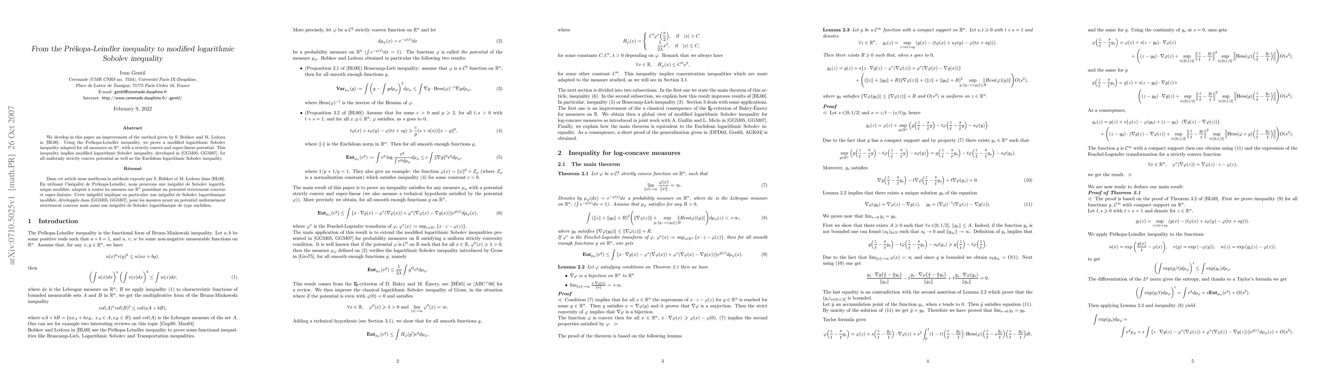 We develop in this paper an improvement of the method given by S. Bobkov and M. Ledoux. Using the Pr\'ekopa-Leindler inequality, we prove a modified logarithmic Sobolev inequality adapted for all measures on $\dR^n$, with a strictly convex and super-linear potential. This inequality implies modified logarithmic Sobolev inequality for all uniform strictly convex potential as well as the Euclidean logarithmic Sobolev inequality.