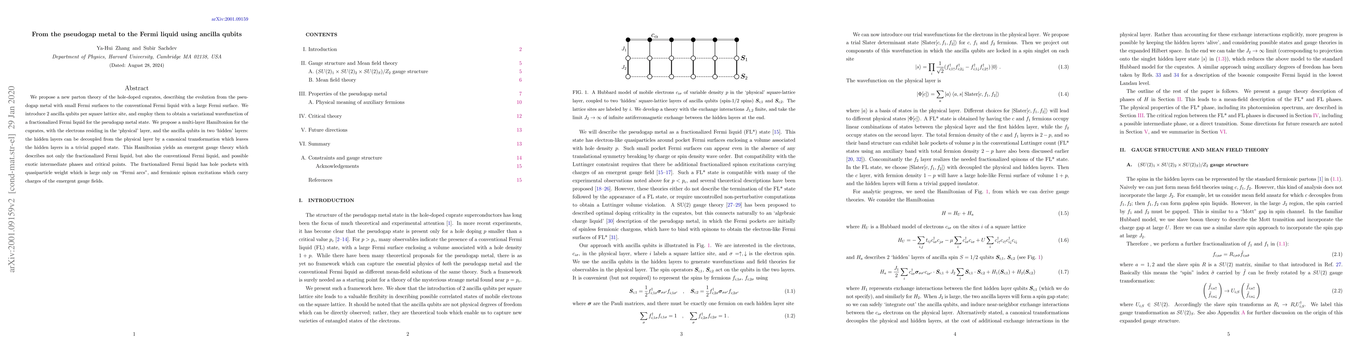 This paper proposes a new parton theory for hole-doped cuprates, introducing ancilla qubits to transition from a pseudogap metal to a conventional Fermi liquid, employing a multi-layer Hamiltonian with fractionalized Fermi liquid states and emergent gauge theory. The theory describes various phases and critical points between the pseudogap metal and Fermi liquid states.