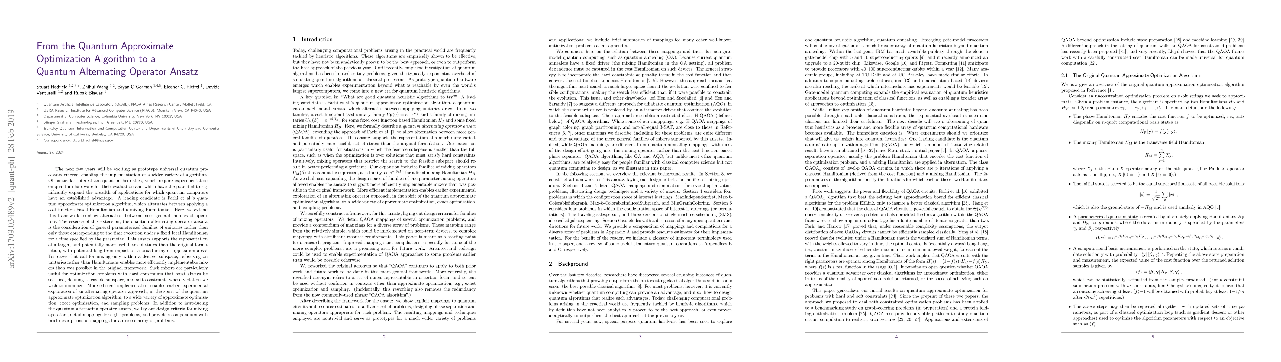 This paper extends the Quantum Approximate Optimization Algorithm (QAOA) to a Quantum Alternating Operator Ansatz, allowing for the alternation between more general families of operators. This new approach supports a broader range of states and more efficient mixers for optimization problems, facilitating earlier experimental exploration of various quantum optimization and sampling problems.