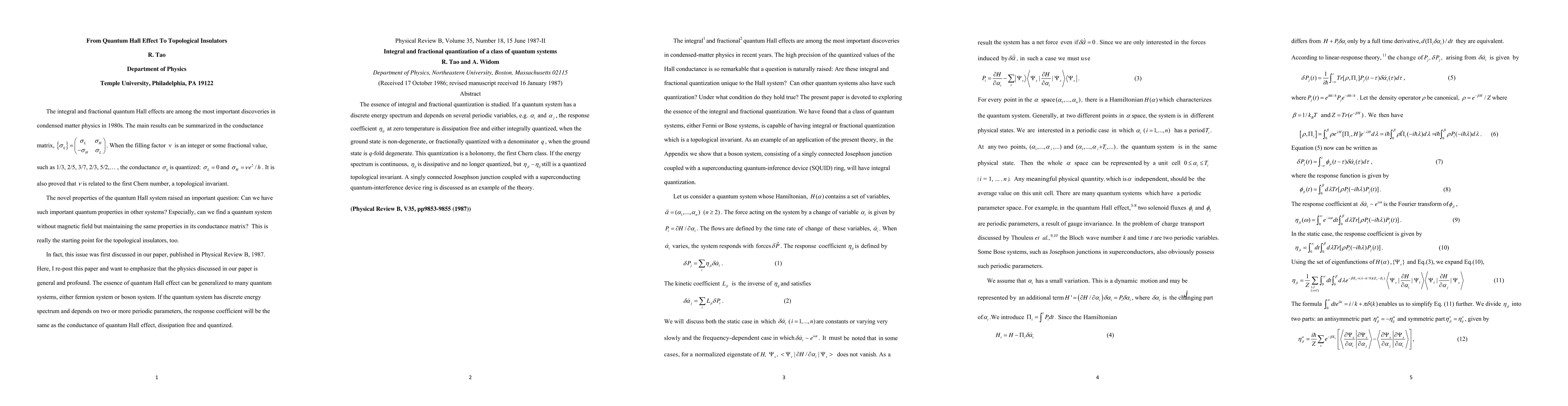 The integral and fractional quantum Hall effects are among the most important discoveries in condensed matter physics in 1980s. The main results can be summarized in the conductance matrix. When the filling factor is an integer or some fractional value, the conductance is quantized. This quantization is related to the first Chern number. The novel properties of the quantum Hall system raised an important question: Can we have such important quantum properties in other systems? Especially, can we find a quantum system without magnetic field but maintaining the same properties in its conductance matrix? This is really the starting point for the topological insulators, too. This issue was first discussed in our paper, published in Physical Review B, 1987. Here, we re-post this paper and want to emphasize that the physics discussed in our paper is general and profound. The essence of quantum Hall effect can be generalized to many quantum systems, either fermion system or boson system. If the quantum system has discrete energy spectrum and depends on two or more periodic parameters, the response coefficient will be the same as the conductance of quantum Hall effect, dissipation free for the longitudinal ones and quantized for off-diagonal ones.