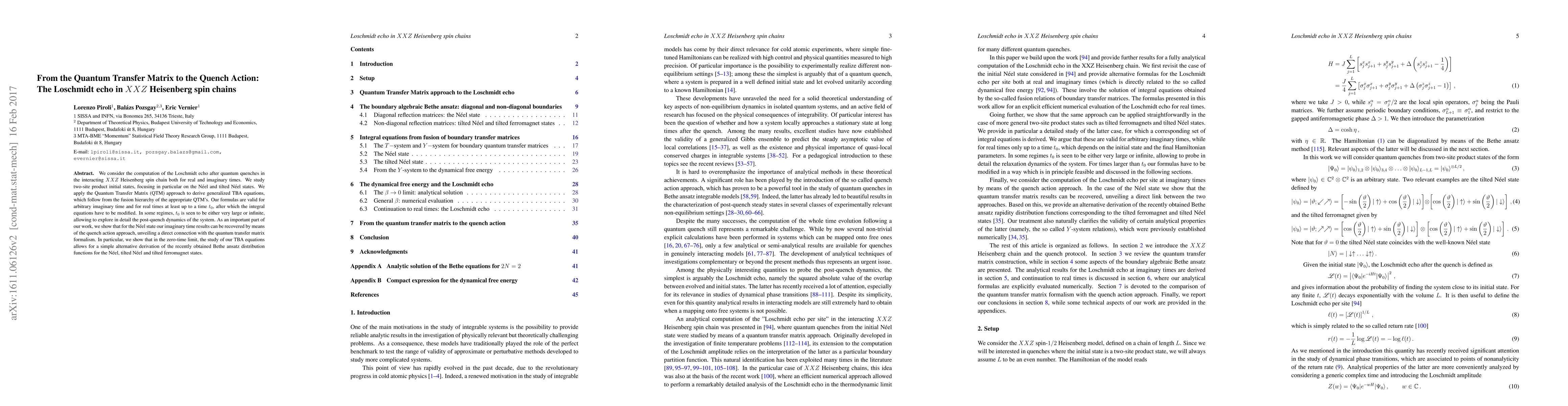 This paper investigates the Loschmidt echo in the $XXZ$ Heisenberg spin chain after quantum quenches, employing the Quantum Transfer Matrix approach to derive generalized thermodynamic Bethe ansatz (TBA) equations. It reveals a connection between the quench action and the quantum transfer matrix formalism, particularly for N\'eel states, and provides insights into post-quench dynamics.