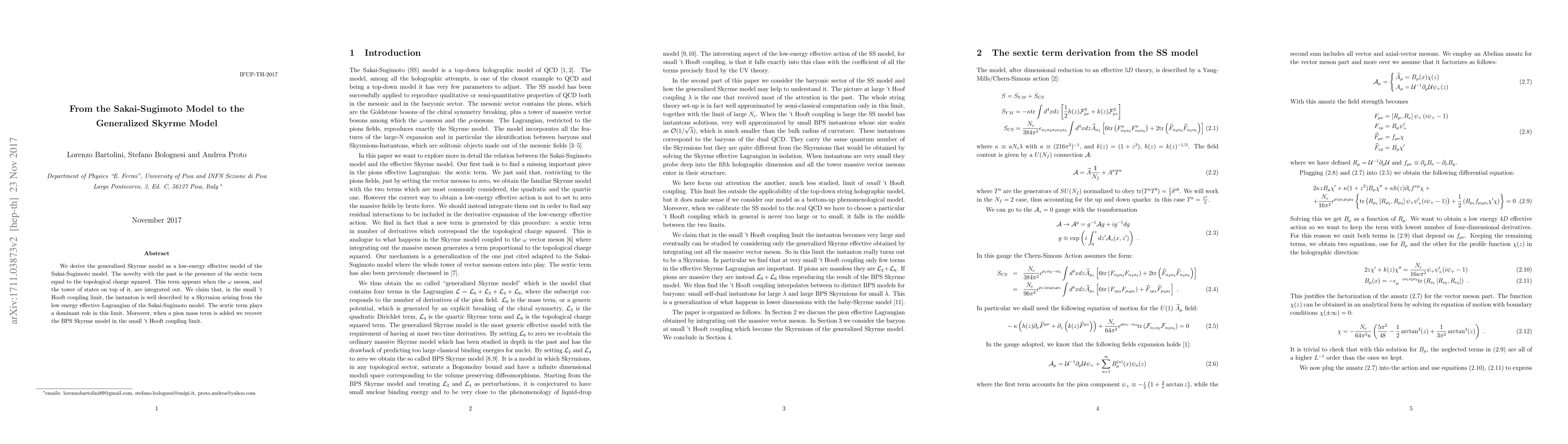 We derive the generalized Skyrme model as a low-energy effective model of the Sakai-Sugimoto model. The novelty with the past is the presence of the sextic term equal to the topological charge squared. This term appears when the $\omega$ meson, and the tower of states on top of it, are integrated out. We claim that, in the small 't Hooft coupling limit, the instanton is well described by a Skyrmion arising from the low energy effective Lagrangian of the Sakai-Sugimoto model. The sextic term plays a dominant role in this limit. Moreover, when a pion mass term is added we recover the BPS Skyrme model in the small 't Hooft coupling limit.