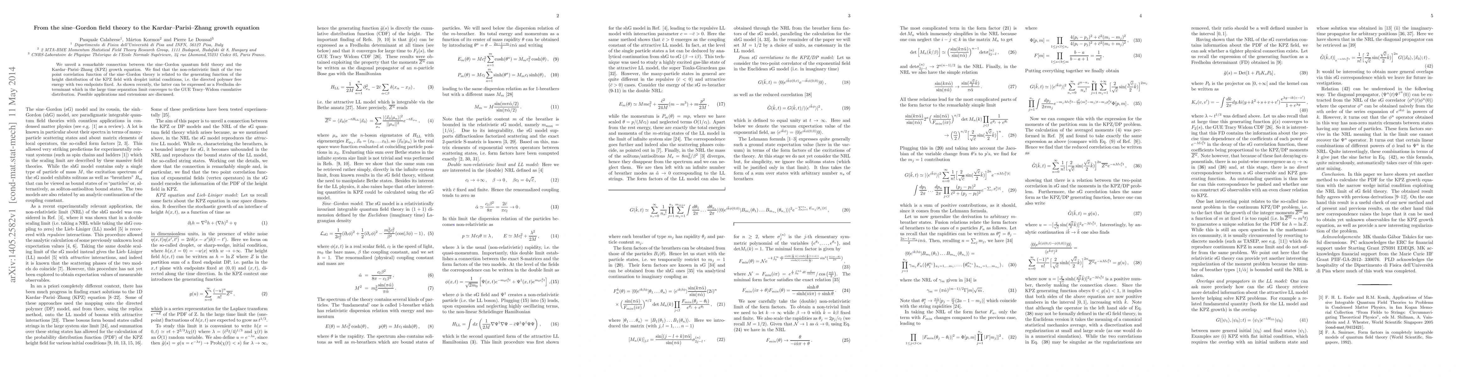We unveil a remarkable connection between the sine-Gordon quantum field theory and the Kardar-Parisi-Zhang (KPZ) growth equation. We find that the non-relativistic limit of the two point correlation function of the sine-Gordon theory is related to the generating function of the height distribution of the KPZ field with droplet initial conditions, i.e. the directed polymer free energy with two endpoints fixed. As shown recently, the latter can be expressed as a Fredholm determinant which in the large time separation limit converges to the GUE Tracy-Widom cumulative distribution. Possible applications and extensions are discussed.