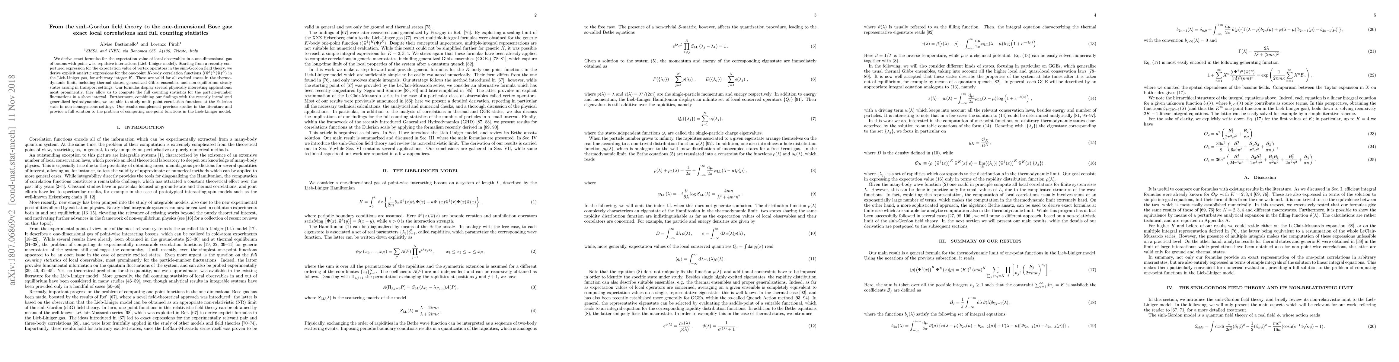 This paper derives exact formulas for local observables in the Lieb-Liniger model, a one-dimensional Bose gas with repulsive interactions, using sinh-Gordon field theory. It provides analytic expressions for one-point $K$-body correlation functions and computes full counting statistics for particle-number fluctuations, complementing previous studies and offering a complete solution to one-point function computation.