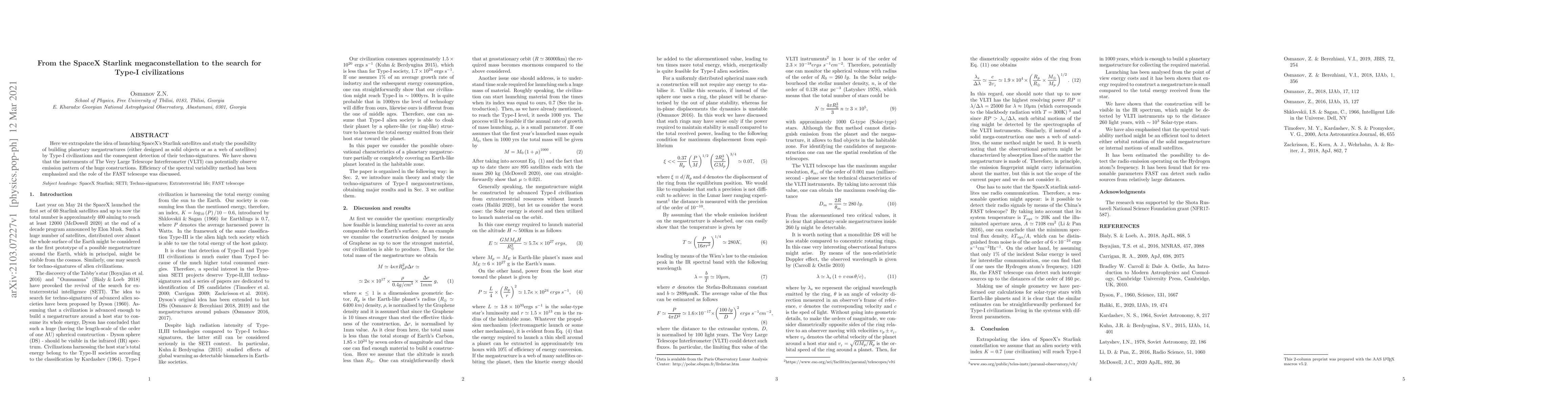 This research explores the potential of Type-I civilizations constructing megastructures akin to SpaceX's Starlink, using VLTI and FAST telescopes to detect such techno-signatures. Efficiency of spectral variability methods is highlighted.