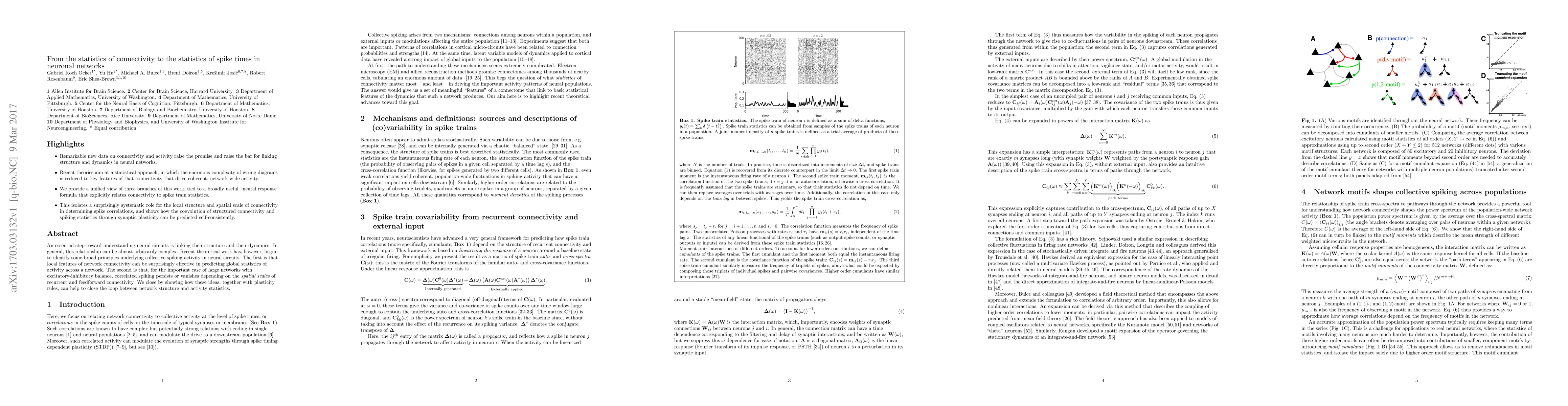 An essential step toward understanding neural circuits is linking their structure and their dynamics. In general, this relationship can be almost arbitrarily complex. Recent theoretical work has, however, begun to identify some broad principles underlying collective spiking activity in neural circuits. The first is that local features of network connectivity can be surprisingly effective in predicting global statistics of activity across a network. The second is that, for the important case of large networks with excitatory-inhibitory balance, correlated spiking persists or vanishes depending on the spatial scales of recurrent and feedforward connectivity. We close by showing how these ideas, together with plasticity rules, can help to close the loop between network structure and activity statistics.