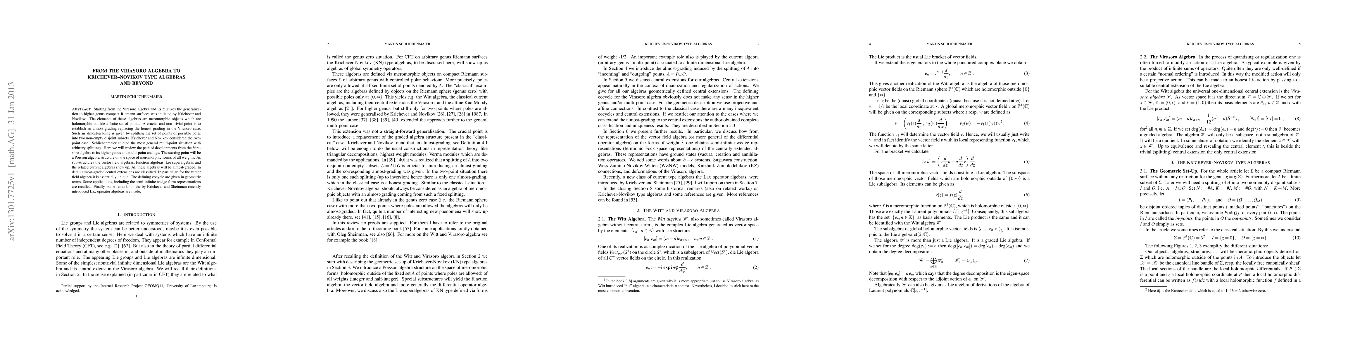 Starting from the Virasoro algebra and its relatives the generalization to higher genus compact Riemann surfaces was initiated by Krichever and Novikov. The elements of these algebras are meromorphic objects which are holomorphic outside a finite set of points. A crucial and non-trivial point is to establish an almost-grading replacing the honest grading in the Virasoro case. Such an almost-grading is given by splitting the set of points of possible poles into two non-empty disjoint subsets. Krichever and Novikov considered the two-point case. Schlichenmaier studied the most general multi-point situation with arbitrary splittings. Here we will review the path of developments from the Virasoro algebra to its higher genus and multi-point analogs. The starting point will be a Poisson algebra structure on the space of meromorphic forms of all weights. As sub-structures the vector field algebras, function algebras, Lie superalgebras and the related current algebras show up. All these algebras will be almost-graded. In detail almost-graded central extensions are classified. In particular, for the vector field algebra it is essentially unique. The defining cocycle are given in geometric terms. Some applications, including the semi-infinite wedge form representations are recalled. Finally, some remarks on the by Krichever and Sheinman recently introduced Lax operator algebras are made.