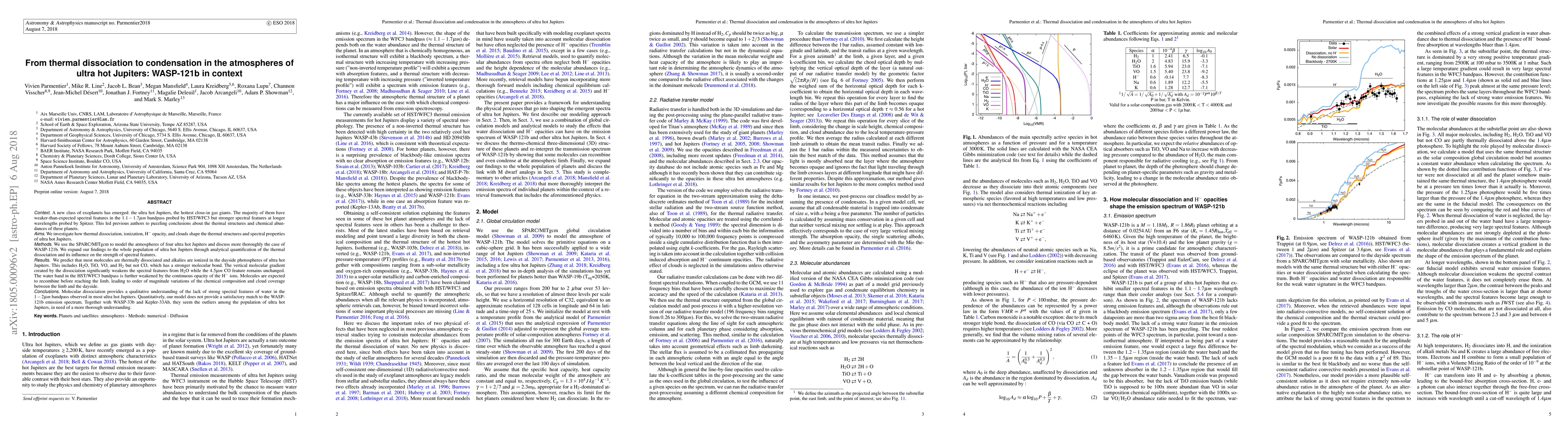 This paper investigates the thermal dissociation and condensation processes in the atmospheres of ultra hot Jupiters, focusing on WASP-121b. It finds that most molecules, including water and TiO, are dissociated on the dayside, which explains the weak spectral features in the $1.1-1.7\mu m$ bandpass, but CO remains intact. The model suggests significant variations in chemical composition and cloud coverage between the dayside and the limb.