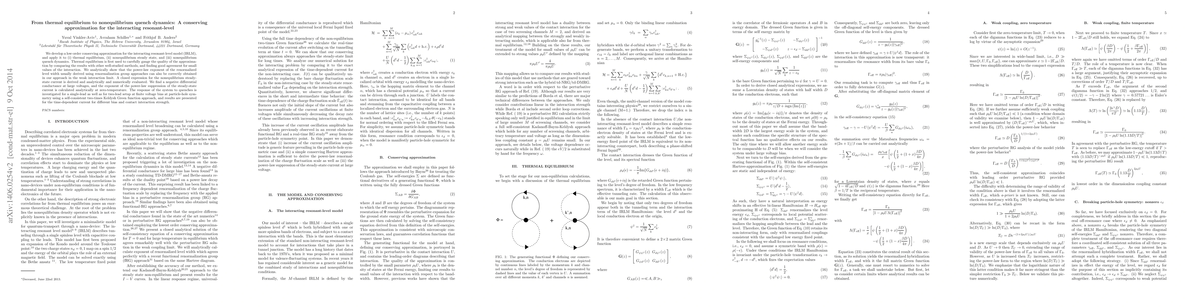 This paper develops a conserving approximation for the interacting resonant-level model, applying it to thermal equilibrium, nonequilibrium steady states, and nonequilibrium quench dynamics. The approximation accurately reproduces results from other methods, showing a negative differential conductance and a power-law suppression of current, and provides insights into system response to quenches.