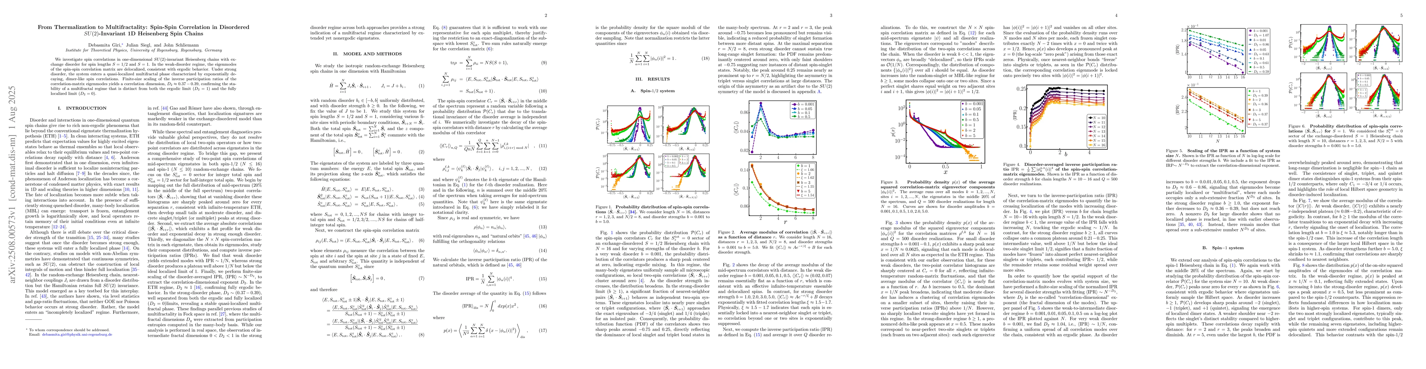 We investigate spin correlations in one-dimensional $SU(2)$-invariant Heisenberg chains with exchange disorder for spin lengths $S=1/2$ and $S=1$. In the weak-disorder regime, the eigenmodes of the spin-spin correlation matrix are delocalized, consistent with ergodic behavior. Under strong disorder, the system enters a quasi-localized multifractal phase characterized by exponentially decaying, dimer-like spin correlations. Finite-size scaling of the inverse participation ratios of the correlation-matrix eigenmodes yields a correlation dimension, $D_2\approx 0.37-0.39$, confirming the stability of a multifractal regime that is distinct from both the ergodic limit ($D_2=1$) and the fully localized limit ($D_2=0$).