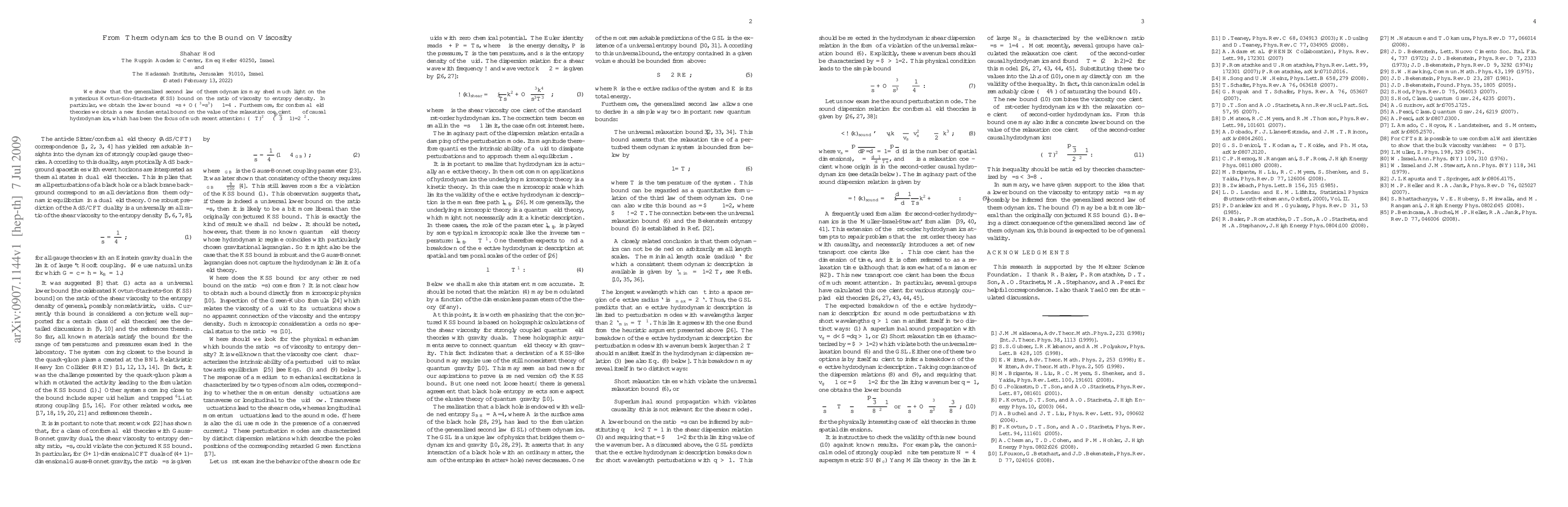 We show that the generalized second law of thermodynamics may shed much light on the mysterious Kovtun-Son-Starinets (KSS) bound on the ratio of viscosity to entropy density. In particular, we obtain the lower bound $\eta/s +O(\eta^3/s^3)\geq 1/4\pi$. Furthermore, for conformal field theories we obtain a new fundamental bound on the value of the relaxation coefficient $\tau_{\pi}$ of causal hydrodynamics, which has been the focus of much recent attention: $(\tau_{\pi}T)^2\geq {{(\sqrt{3}-1)}/{2\pi^2}}$.