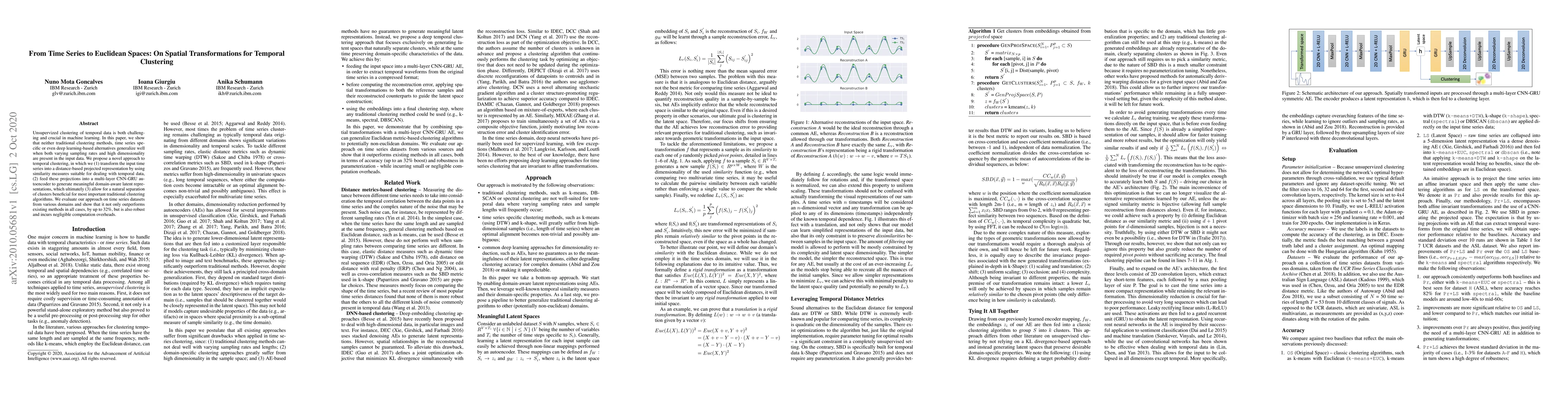 A new approach to temporal clustering is proposed, transforming time series into Euclidean spaces using similarity measures and multi-layer CNN-GRU autoencoders, outperforming existing methods with up to 32% improvement.