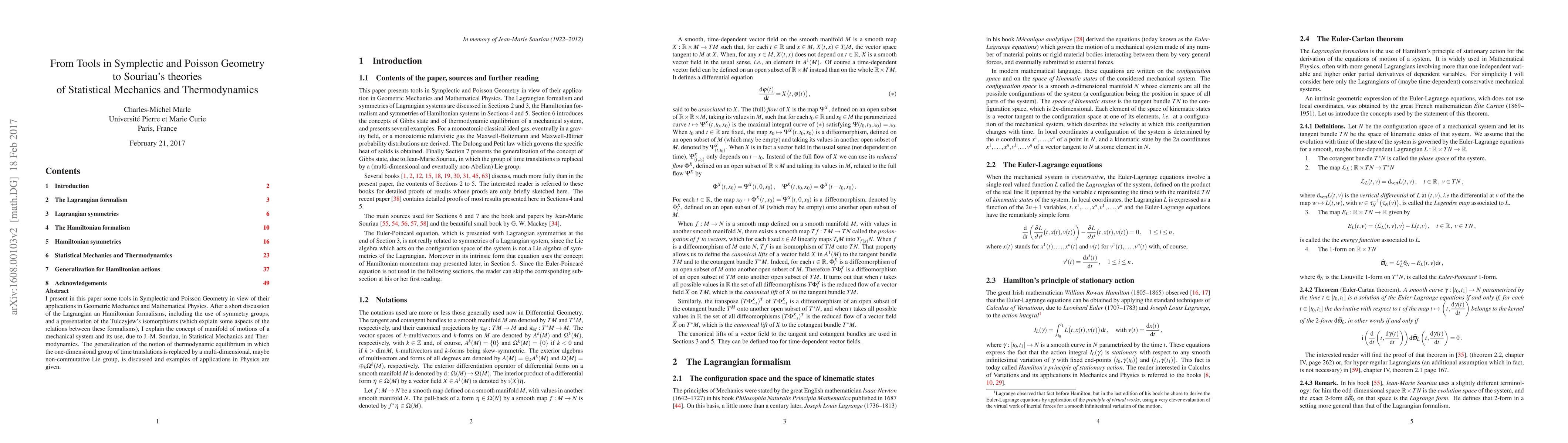 I present in this paper some tools in Symplectic and Poisson Geometry in view of their applications in Geometric mechanics and Mathematical Physics. After a short discussion of the Lagrangian and Hamiltonian formalisms, including the use of symmetry groups, and a presentation of the Tulczyjew's isomorphisms (which explain some aspects of the relations between these formalisms), I explain the concept of manifold of motions of a mechanical system and its use, due to J.-M. Souriau, in Statistical Mechanics and Thermodynamics. The generalization of the notion of thermodynamic equilibrium in which the one-dimensional group of time translations is replaced by a multi-dimensional, maybe non-commutative Lie group, is discussed and examples of applications in Physics are given.