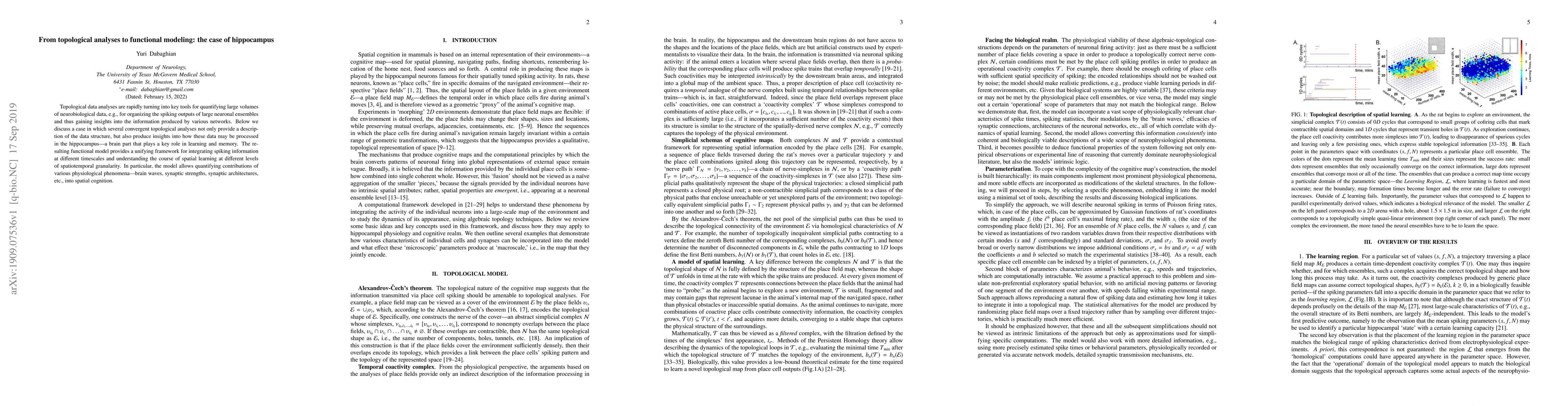 Topological data analyses are rapidly turning into key tools for quantifying large volumes of neurobiological data, e.g., for organizing the spiking outputs of large neuronal ensembles and thus gaining insights into the information produced by various networks. Below we discuss a case in which several convergent topological analyses not only provide a description of the data structure, but also produce insights into how these data may be processed in the hippocampus---a brain part that plays a key role in learning and memory. The resulting functional model provides a unifying framework for integrating spiking information at different timescales and understanding the course of spatial learning at different levels of spatiotemporal granularity. In particular, the model allows quantifying contributions of various physiological phenomena---brain waves, synaptic strengths, synaptic architectures, etc., into spatial cognition.