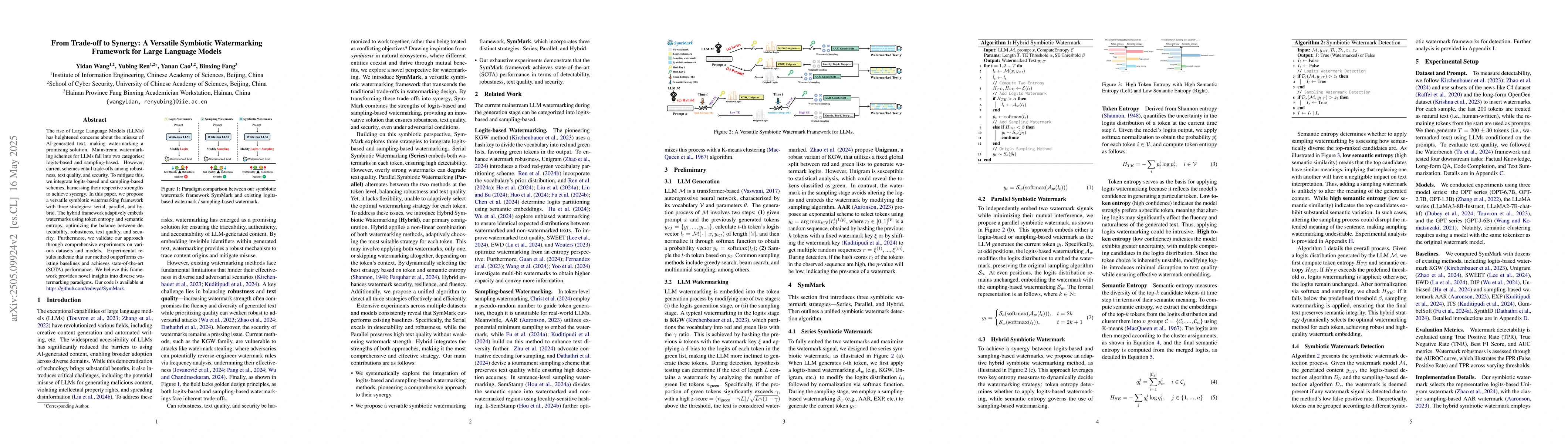 The rise of Large Language Models (LLMs) has heightened concerns about the misuse of AI-generated text, making watermarking a promising solution. Mainstream watermarking schemes for LLMs fall into two categories: logits-based and sampling-based. However, current schemes entail trade-offs among robustness, text quality, and security. To mitigate this, we integrate logits-based and sampling-based schemes, harnessing their respective strengths to achieve synergy. In this paper, we propose a versatile symbiotic watermarking framework with three strategies: serial, parallel, and hybrid. The hybrid framework adaptively embeds watermarks using token entropy and semantic entropy, optimizing the balance between detectability, robustness, text quality, and security. Furthermore, we validate our approach through comprehensive experiments on various datasets and models. Experimental results indicate that our method outperforms existing baselines and achieves state-of-the-art (SOTA) performance. We believe this framework provides novel insights into diverse watermarking paradigms. Our code is available at https://github.com/redwyd/SymMark.