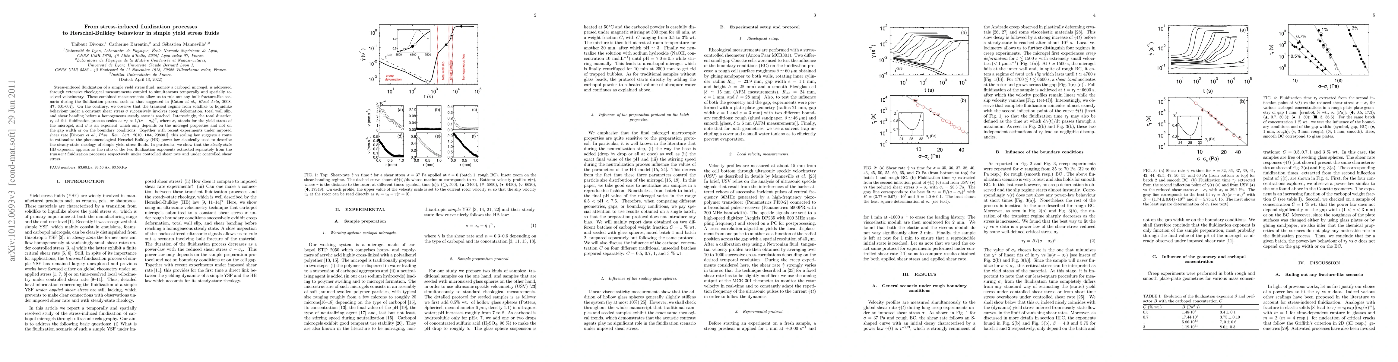 This paper investigates the fluidization process of a yield stress fluid (carbopol microgel) through rheological measurements and velocimetry, revealing a transition from solidlike to liquidlike behavior involving creep, wall slip, and shear banding. The study proposes a scaling law for the fluidization duration and links it to the Herschel-Bulkley model, suggesting a unified approach to describe the steady-state rheology of such fluids.