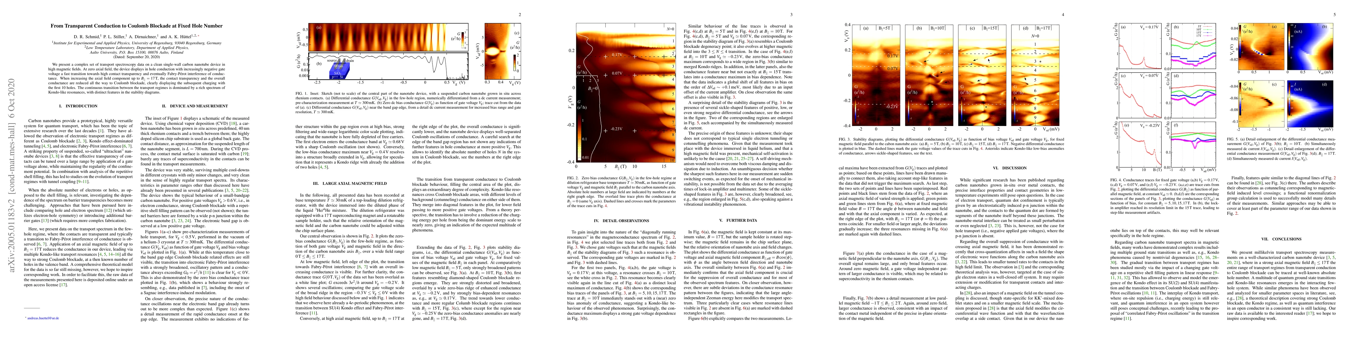 The paper presents transport spectroscopy data on a single-wall carbon nanotube device, showing a transition from transparent hole conduction to Coulomb blockade under high magnetic fields. This transition, observed with up to 17T axial field, reveals a spectrum of Kondo-like resonances and the sequential charging of the first 10 holes.