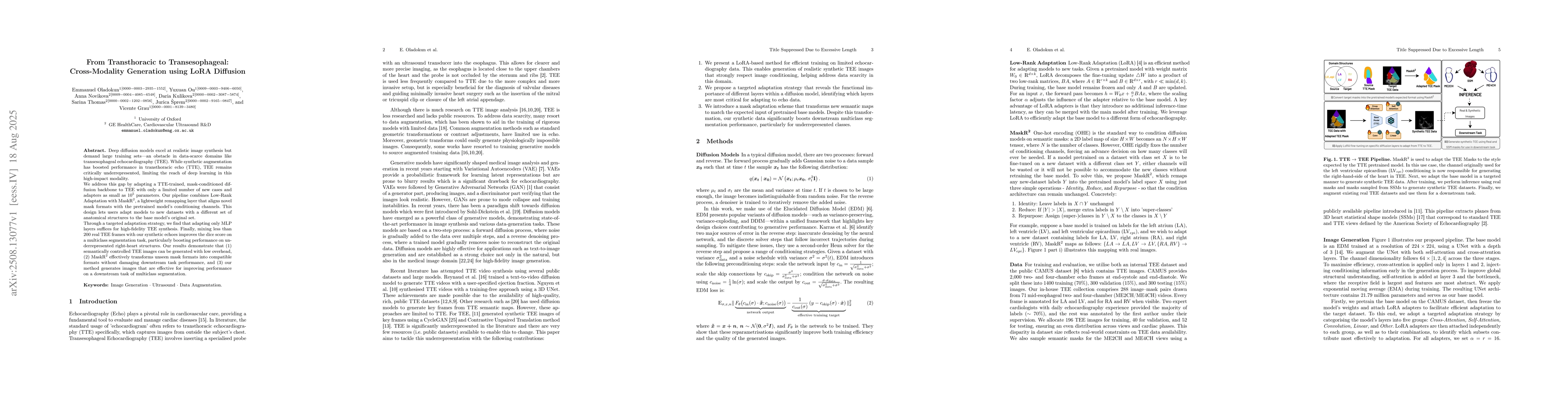 Deep diffusion models excel at realistic image synthesis but demand large training sets-an obstacle in data-scarce domains like transesophageal echocardiography (TEE). While synthetic augmentation has boosted performance in transthoracic echo (TTE), TEE remains critically underrepresented, limiting the reach of deep learning in this high-impact modality. We address this gap by adapting a TTE-trained, mask-conditioned diffusion backbone to TEE with only a limited number of new cases and adapters as small as $10^5$ parameters. Our pipeline combines Low-Rank Adaptation with MaskR$^2$, a lightweight remapping layer that aligns novel mask formats with the pretrained model's conditioning channels. This design lets users adapt models to new datasets with a different set of anatomical structures to the base model's original set. Through a targeted adaptation strategy, we find that adapting only MLP layers suffices for high-fidelity TEE synthesis. Finally, mixing less than 200 real TEE frames with our synthetic echoes improves the dice score on a multiclass segmentation task, particularly boosting performance on underrepresented right-heart structures. Our results demonstrate that (1) semantically controlled TEE images can be generated with low overhead, (2) MaskR$^2$ effectively transforms unseen mask formats into compatible formats without damaging downstream task performance, and (3) our method generates images that are effective for improving performance on a downstream task of multiclass segmentation.