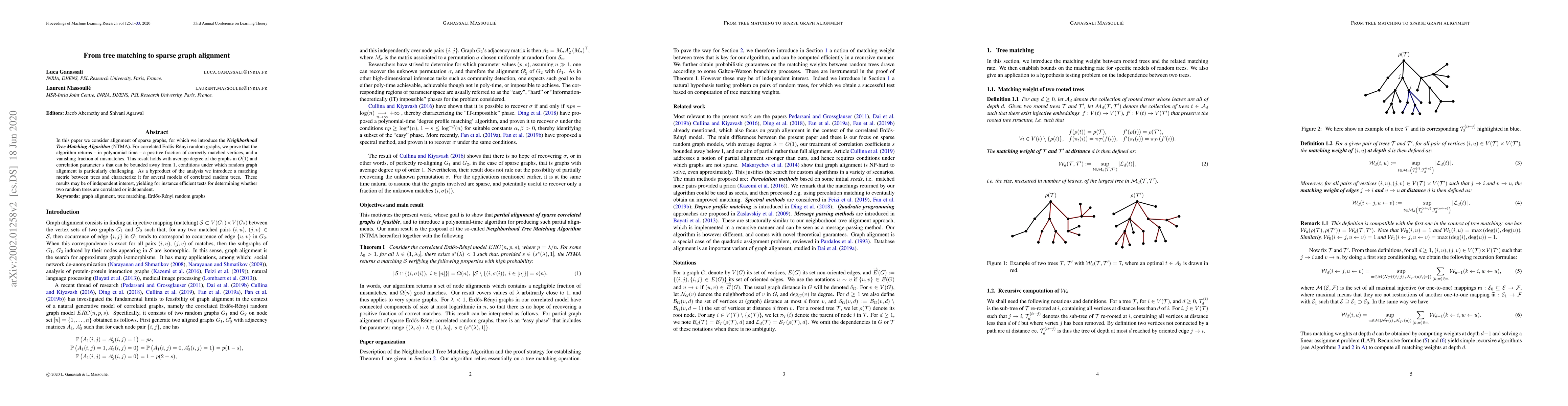 In this paper we consider alignment of sparse graphs, for which we introduce the Neighborhood Tree Matching Algorithm (NTMA). For correlated Erd\H{o}s-R\'{e}nyi random graphs, we prove that the algorithm returns -- in polynomial time -- a positive fraction of correctly matched vertices, and a vanishing fraction of mismatches. This result holds with average degree of the graphs in $O(1)$ and correlation parameter $s$ that can be bounded away from 1, conditions under which random graph alignment is particularly challenging. As a byproduct of the analysis we introduce a matching metric between trees and characterize it for several models of correlated random trees. These results may be of independent interest, yielding for instance efficient tests for determining whether two random trees are correlated or independent.